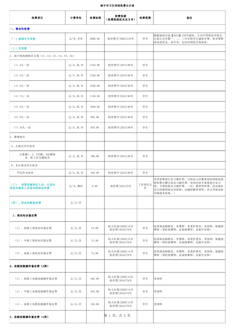 南宁市卫生学校收费公示表