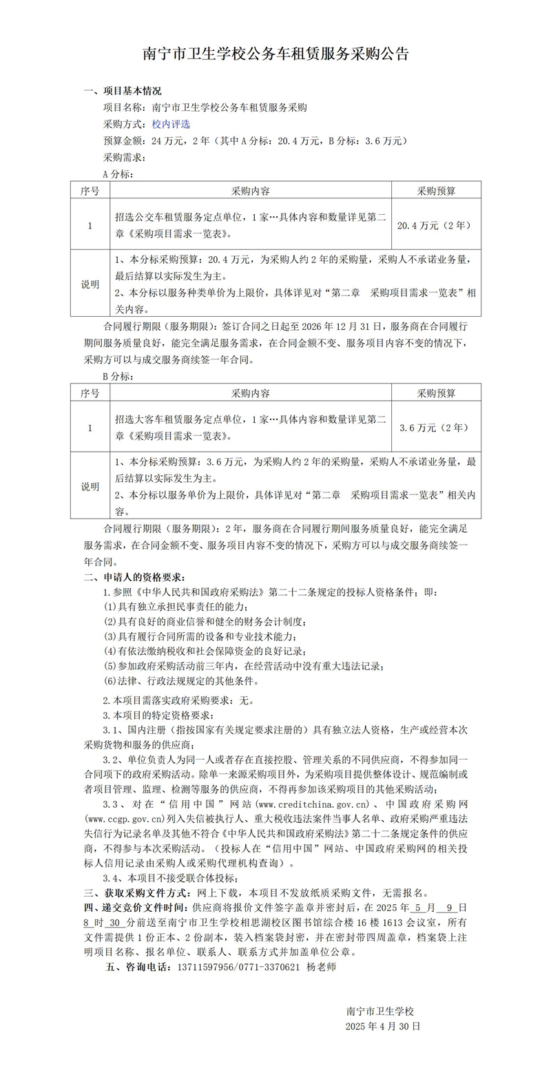 南宁市卫生学校公务车租赁服务采购公告