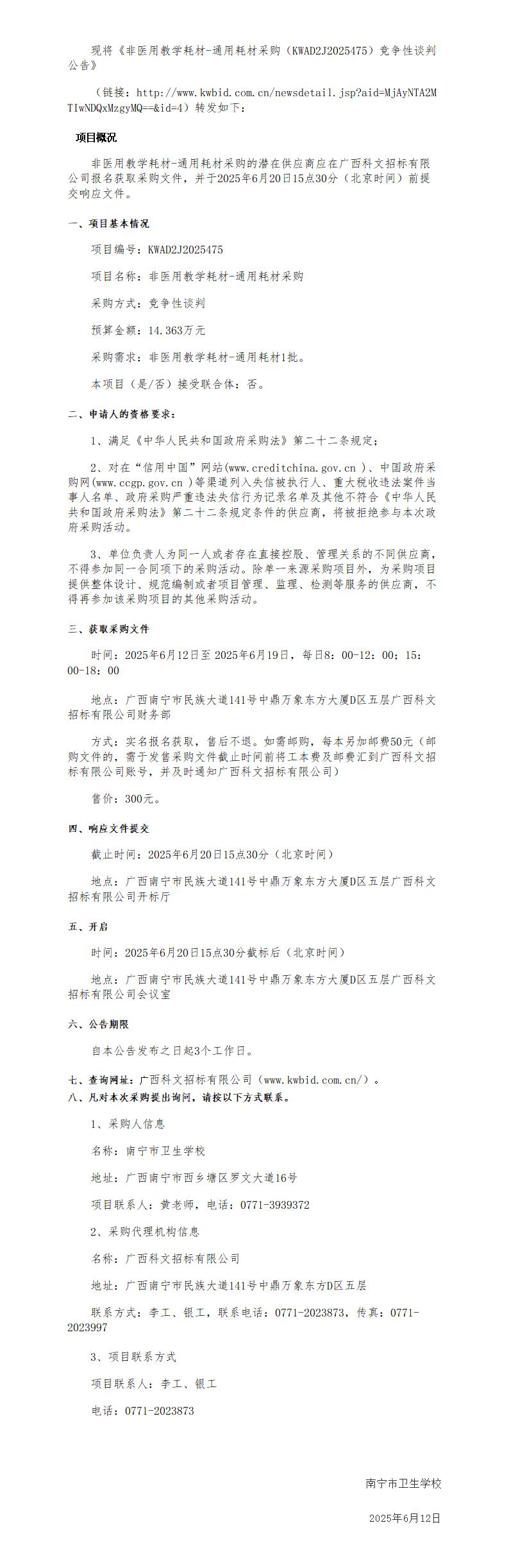 非医用教学耗材-通用耗材采购(KWAD2J2025475)竞争性谈判公告