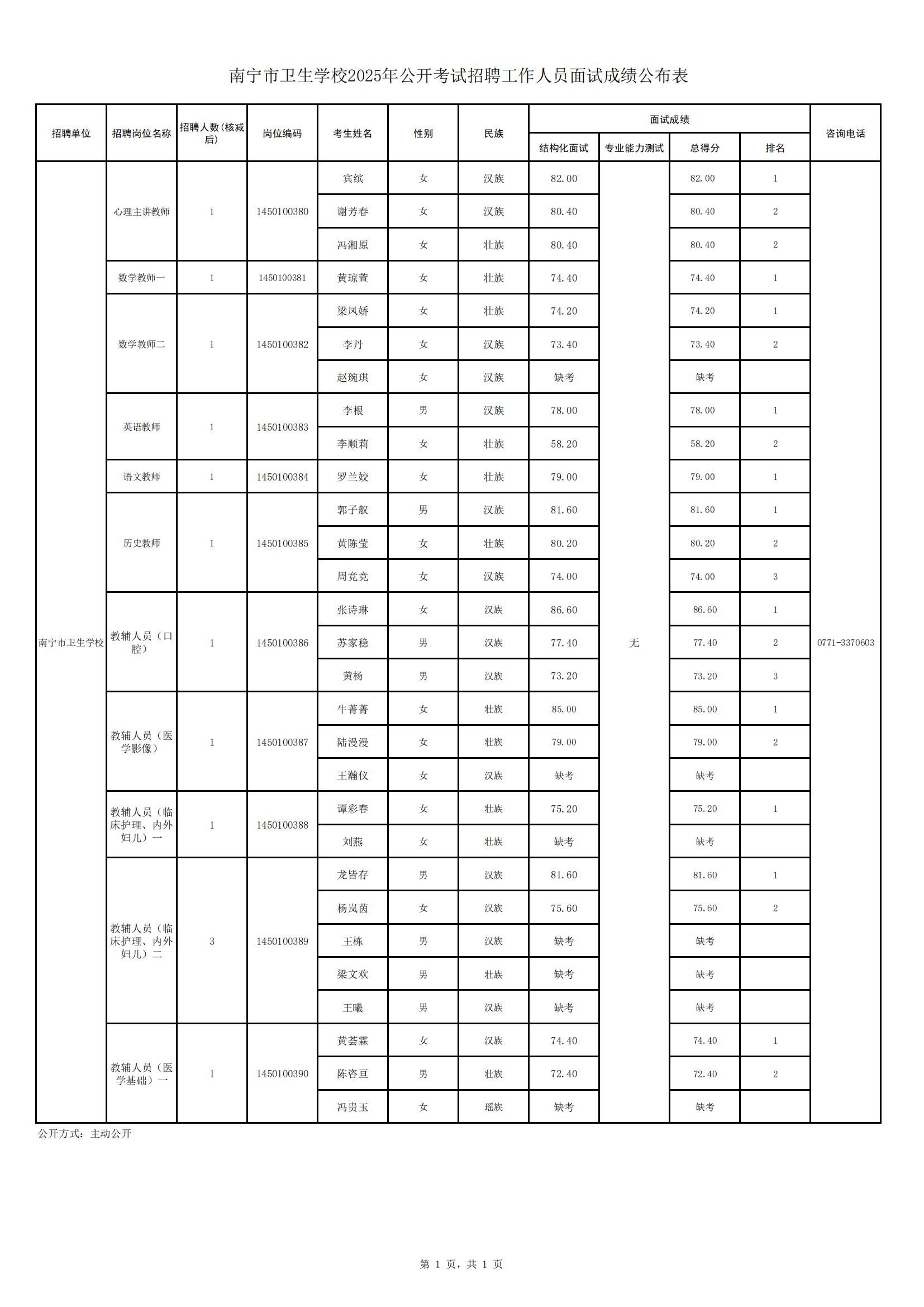 南宁市卫生学校2025年公开考试招聘工作人员面试成绩公布表