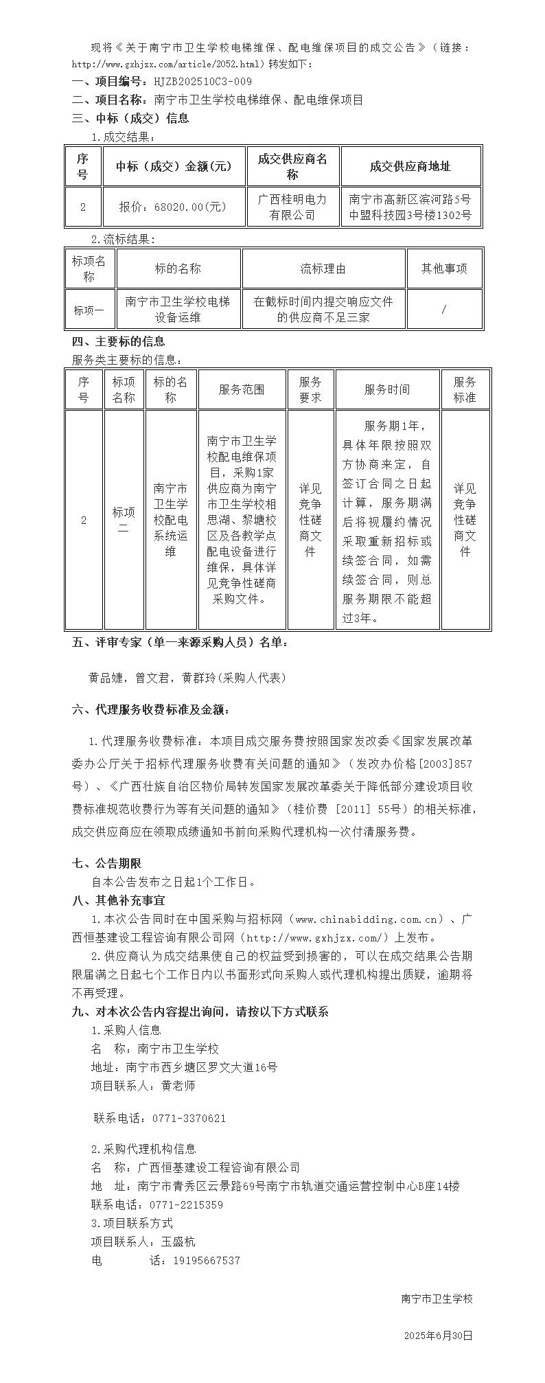 关于南宁市卫生学校电梯维保、配电维保项目的成交公告