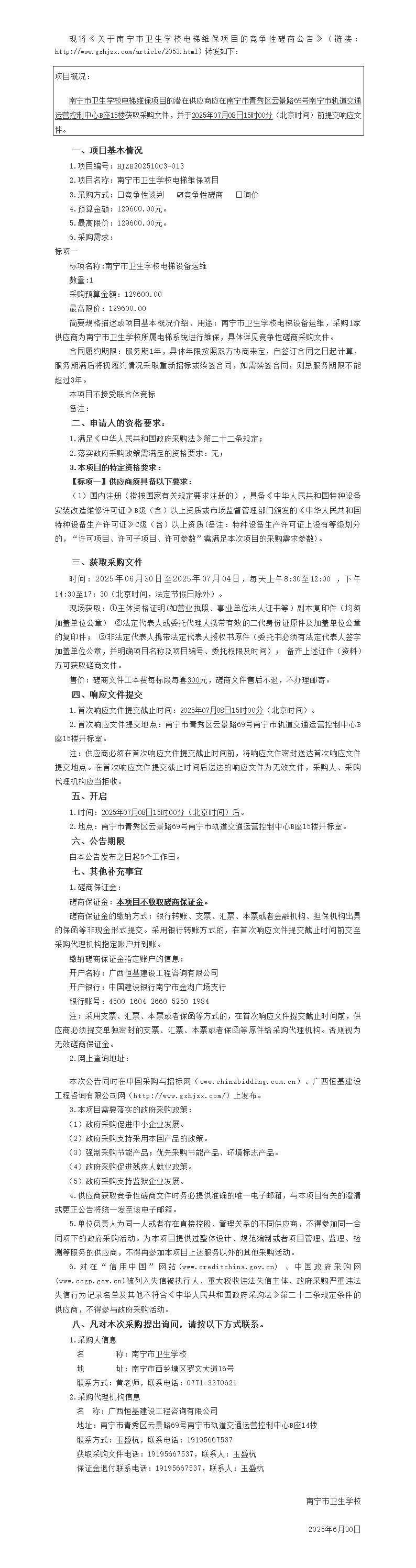 关于南宁市卫生学校电梯维保项目的竞争性磋商公告