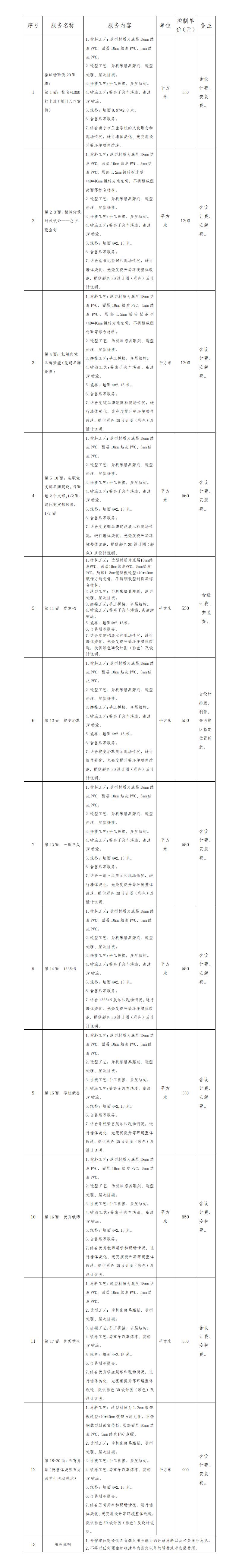 为提升黎塘校园文化建设,营造健康和谐稳定的校园氛围,提升思想引领在学校文化建设的支撑力,充分利用黎塘校区新建排球场周边场地资源,设置校园文化宣阵地。黎塘校区校园文化建设项目需包括:“主题打卡墙”1面墙,“总书记金句”2面墙,“党建品牌矩阵”1面墙,“在职党支部品牌建设展示”6面墙,“党建+N展示”1面墙,“校史沿革展示”1面墙,“一训三风展示”1面墙,“1335+N展示”1面墙,“学校荣誉展示”1面墙,“优秀教师展示”1面墙,“优秀学生展示”1面墙,“五育并举学生活动展示”3面墙,共20面墙面文化建设;该项目里需包含文化墙的设计、文化墙板、橱窗、LED灯。本次公开征集旨在全面了解当前校园文化宣传阵地建设的市场状况、技术标准、服务模式及价格水平,为我校后续科学、合理地制定采购需求提供决策依据。