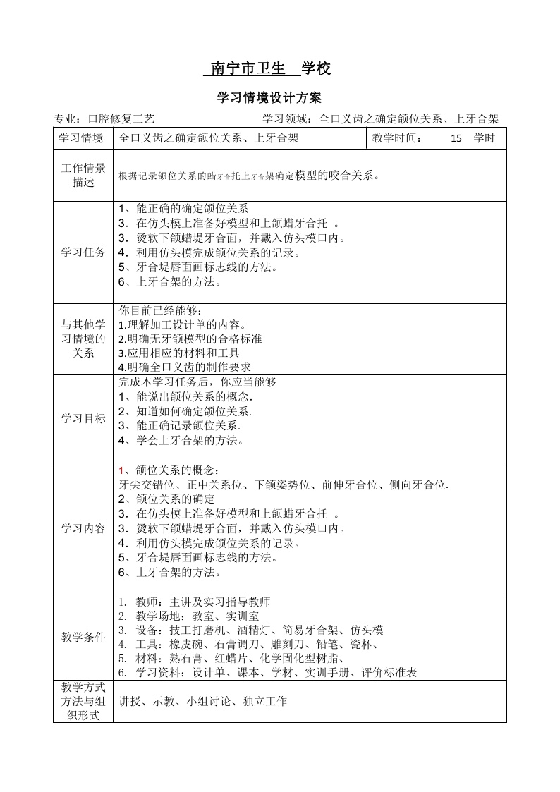 学习情境设计方案3:全口义齿之确定颌位关系、上牙合