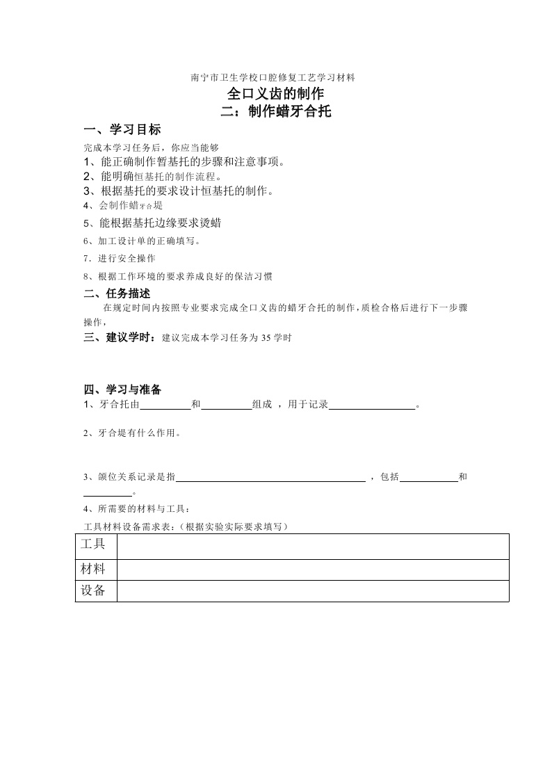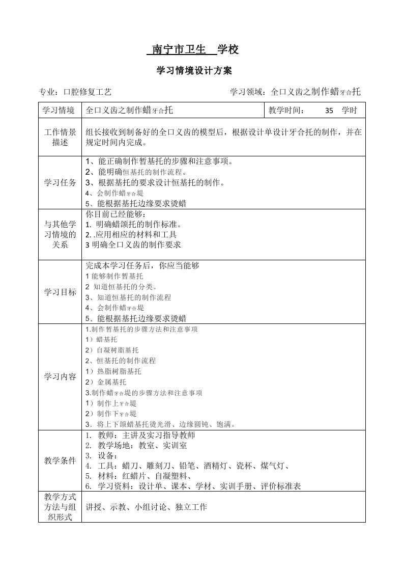 学习情境设计方案2:全口义齿制作蜡牙合托