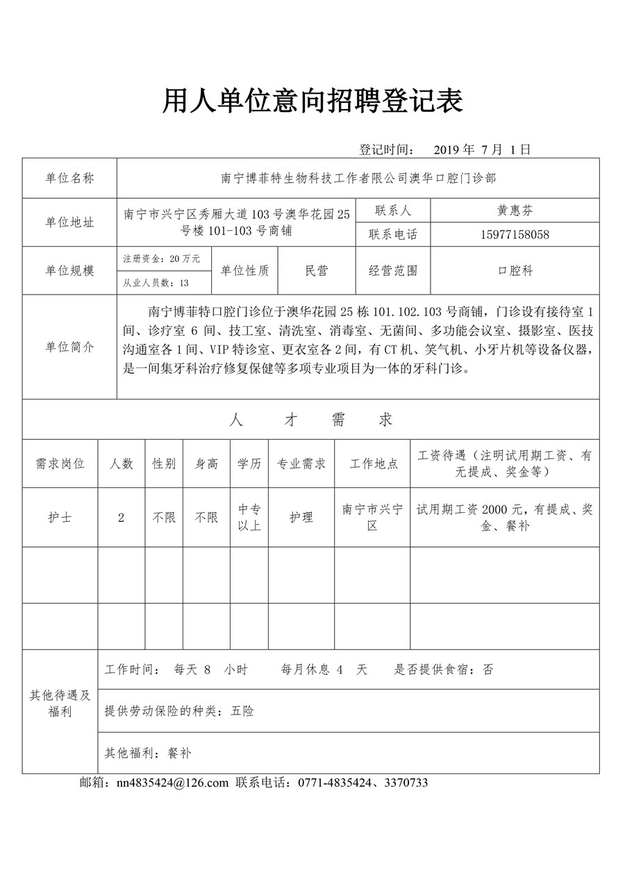 南宁博菲特生物科技工作者限公司澳华口腔门诊部意向招聘