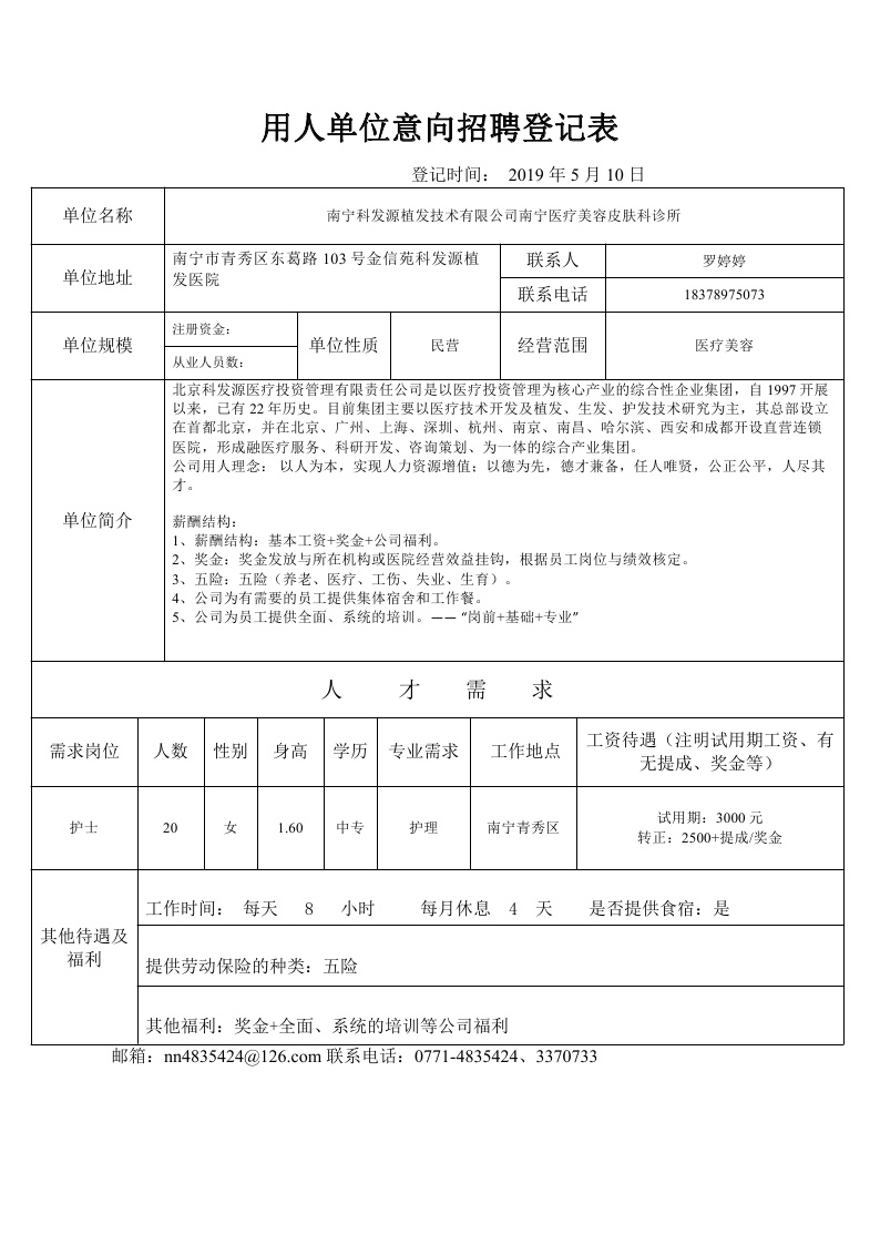 南宁科发源植发技术有限公司南宁医疗美容皮肤科诊所意向招聘