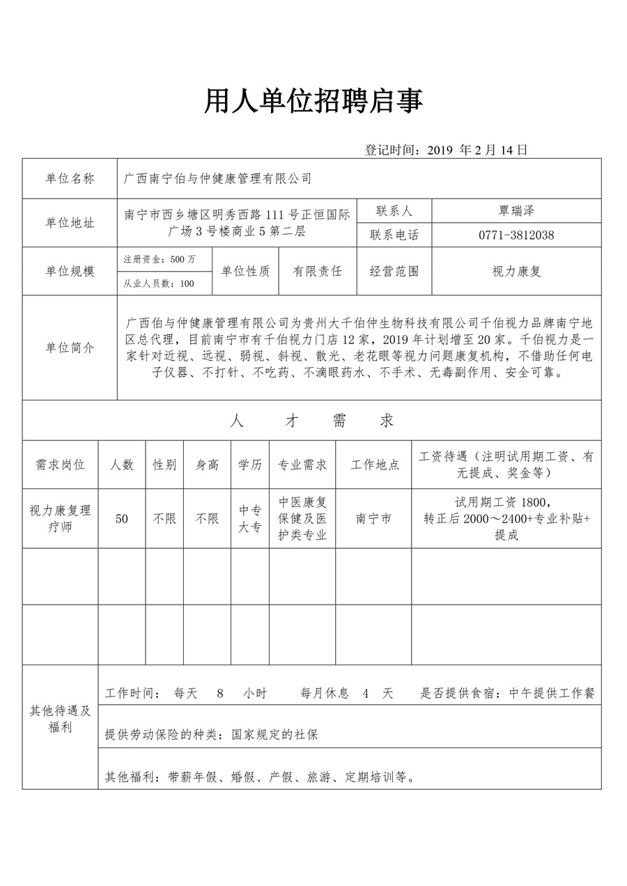广西南宁伯与仲健康管理有限公司招聘