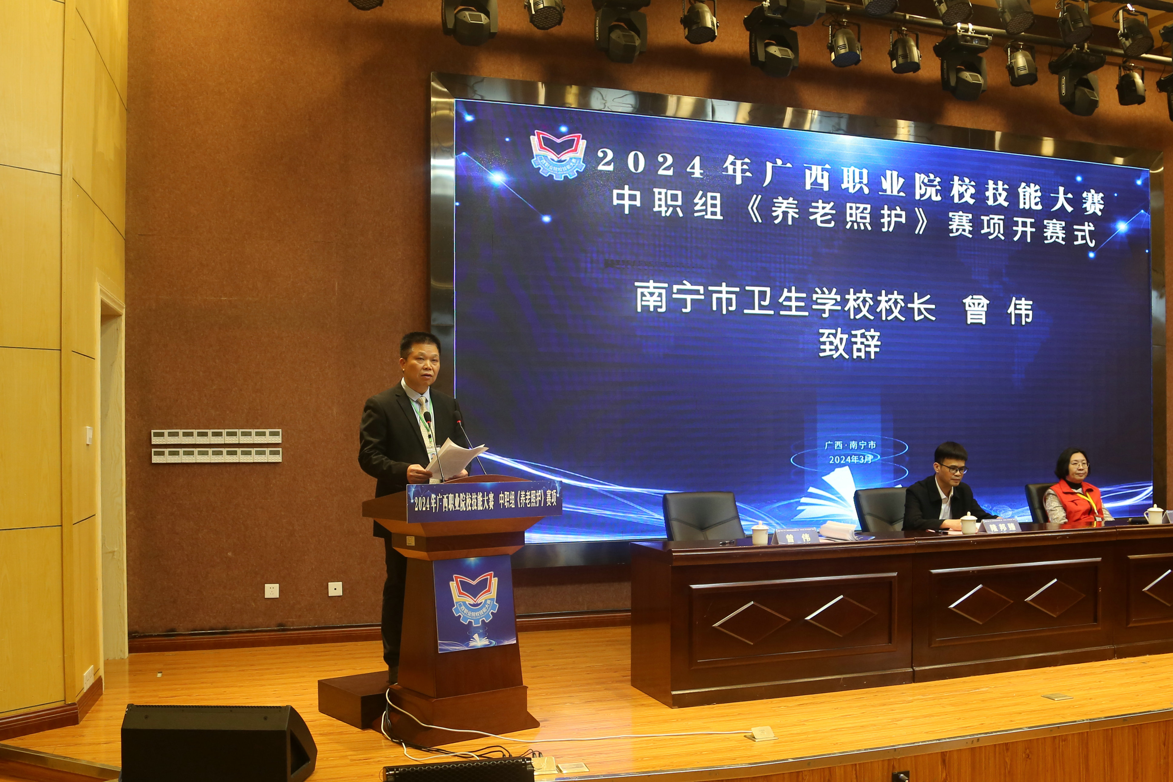 开幕式上,南宁市卫生学校校长曾伟致欢迎辞,向莅临开幕式的各位领导、裁判长、兄弟学校的指导老师和参赛选手表示热烈的欢迎。他表示,承办此次比赛,是教育厅和各兄弟单位对学校教育教学工作的信任和肯定,学校将在大赛组委会的领导下,竭力做好赛事的各项服务工作,确保大赛顺利进行。