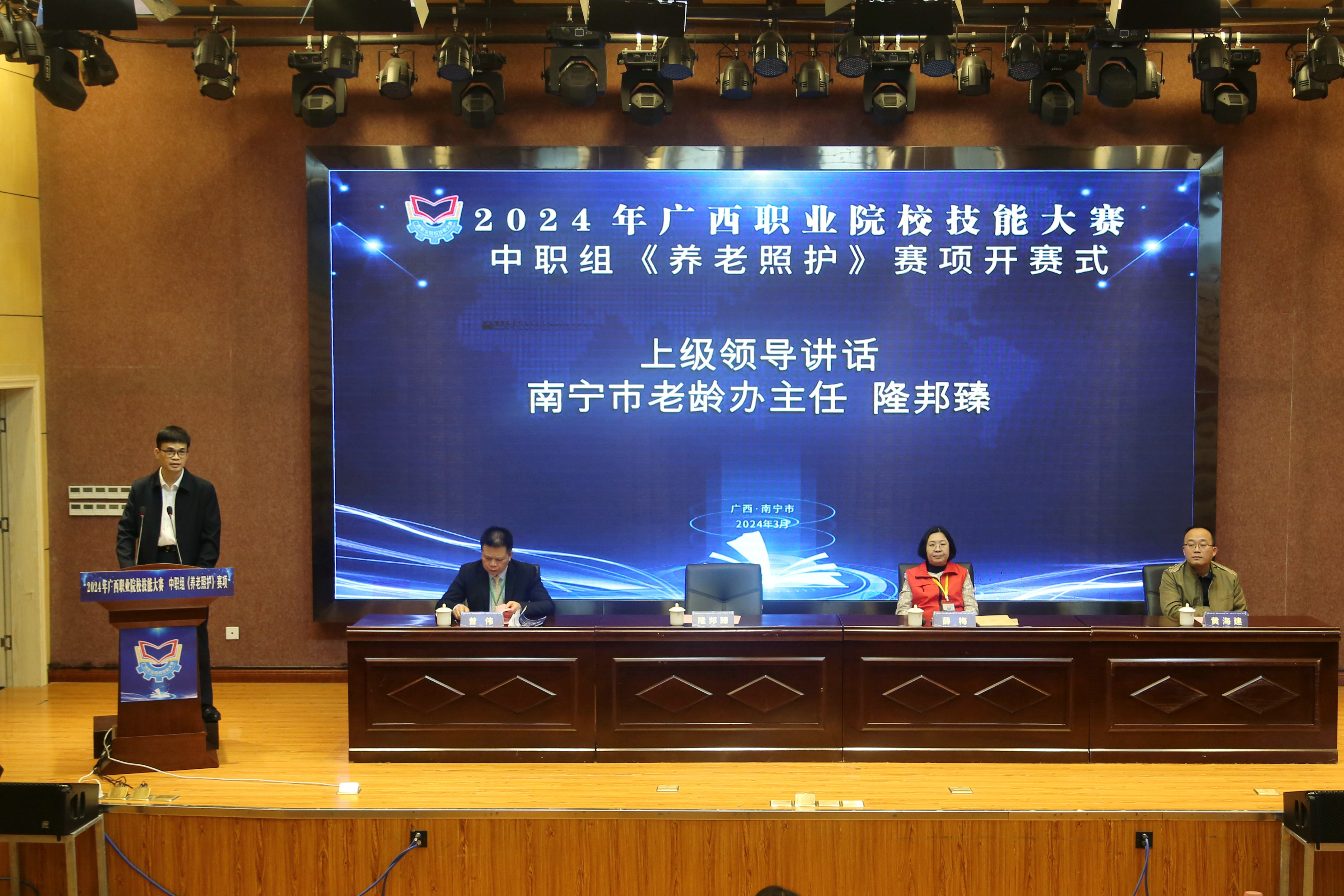 接着,南宁市老龄办主任隆邦臻讲话,他表示,每年举办的职业院校技能大赛作为选拔技能型人才的重要平台,对于提高职业教育质量,深化职业教育教学改革,促进产教融合,深化三教改革都具有十分重要的意义。希望参赛选手在比赛中赛出水平、赛出风采,参赛院校要以此为契机,达到以赛促学、以赛促教,全面提升养老照护专业学生的实践能力。