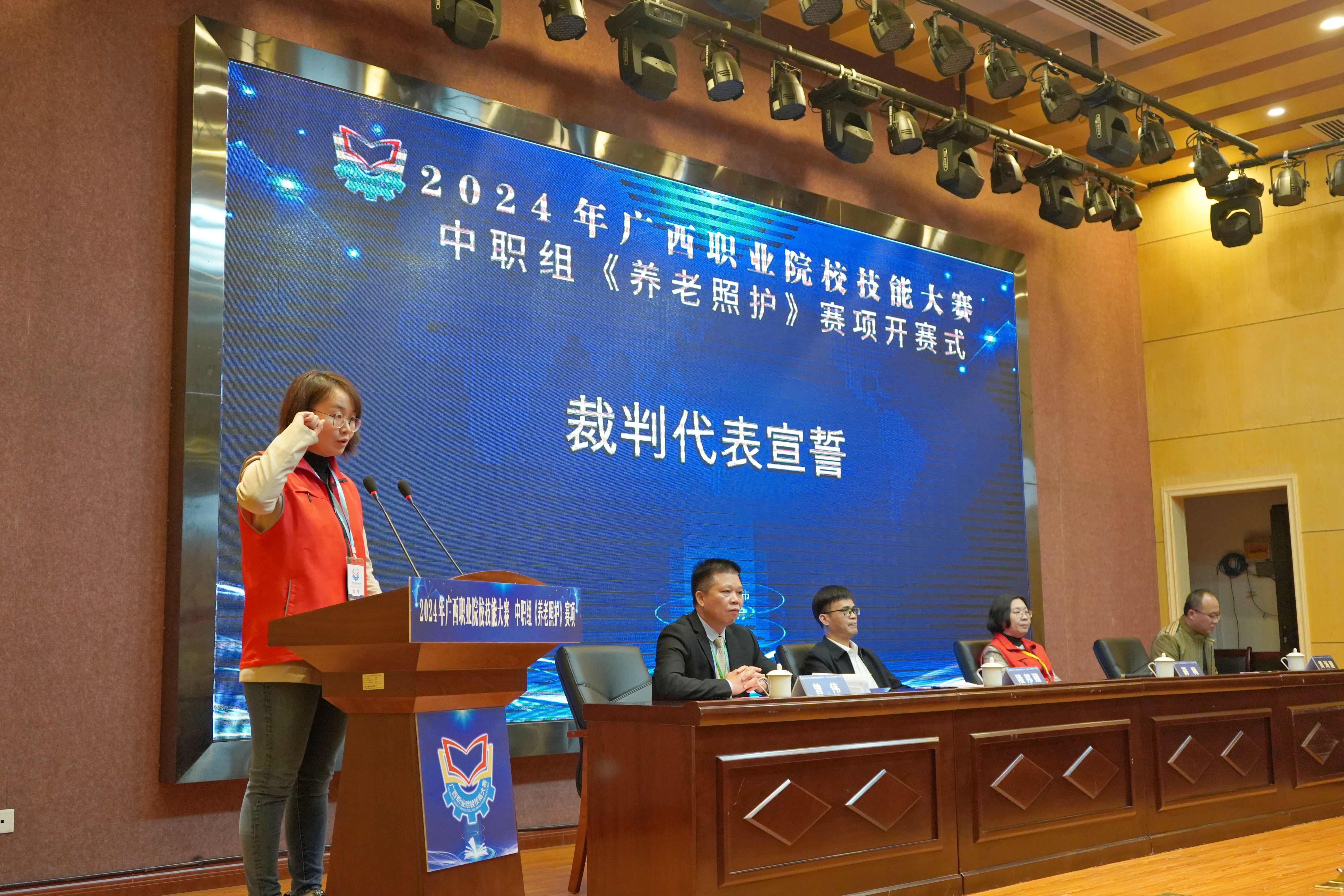 随后,裁判代表和选手代表分别进行了宣誓。总裁判长薛梅宣布赛项开赛。