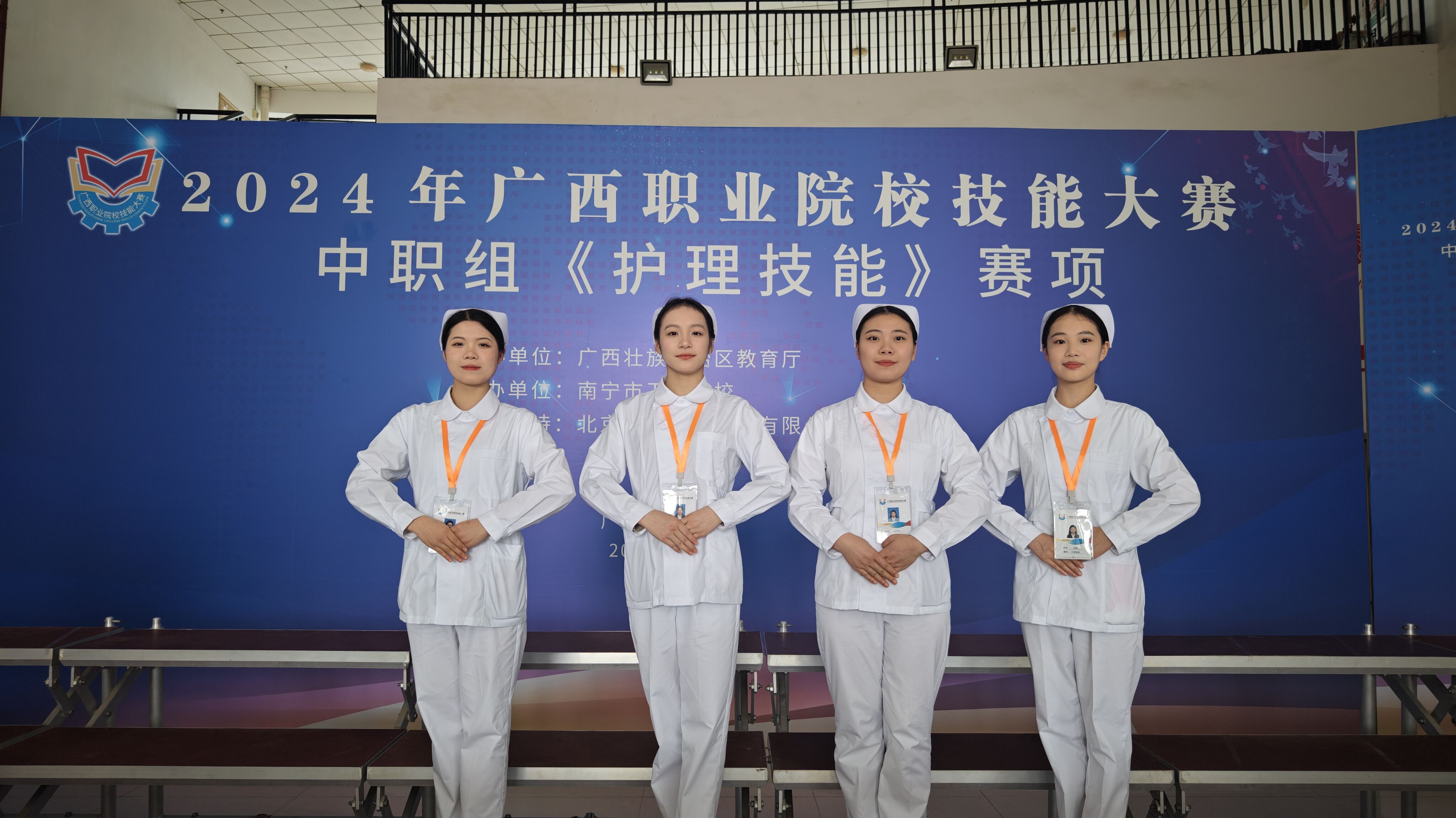 在2024年广西职业院校技能大赛中职组《护理技能》赛项中,我校何妍、韦雨欣团队与周馨妍、陶洪玉团队在32支参赛队中脱颖而出,分别获得团体总成绩排名第1名(拟获一等奖)和第5名(拟获二等奖)的好成绩!