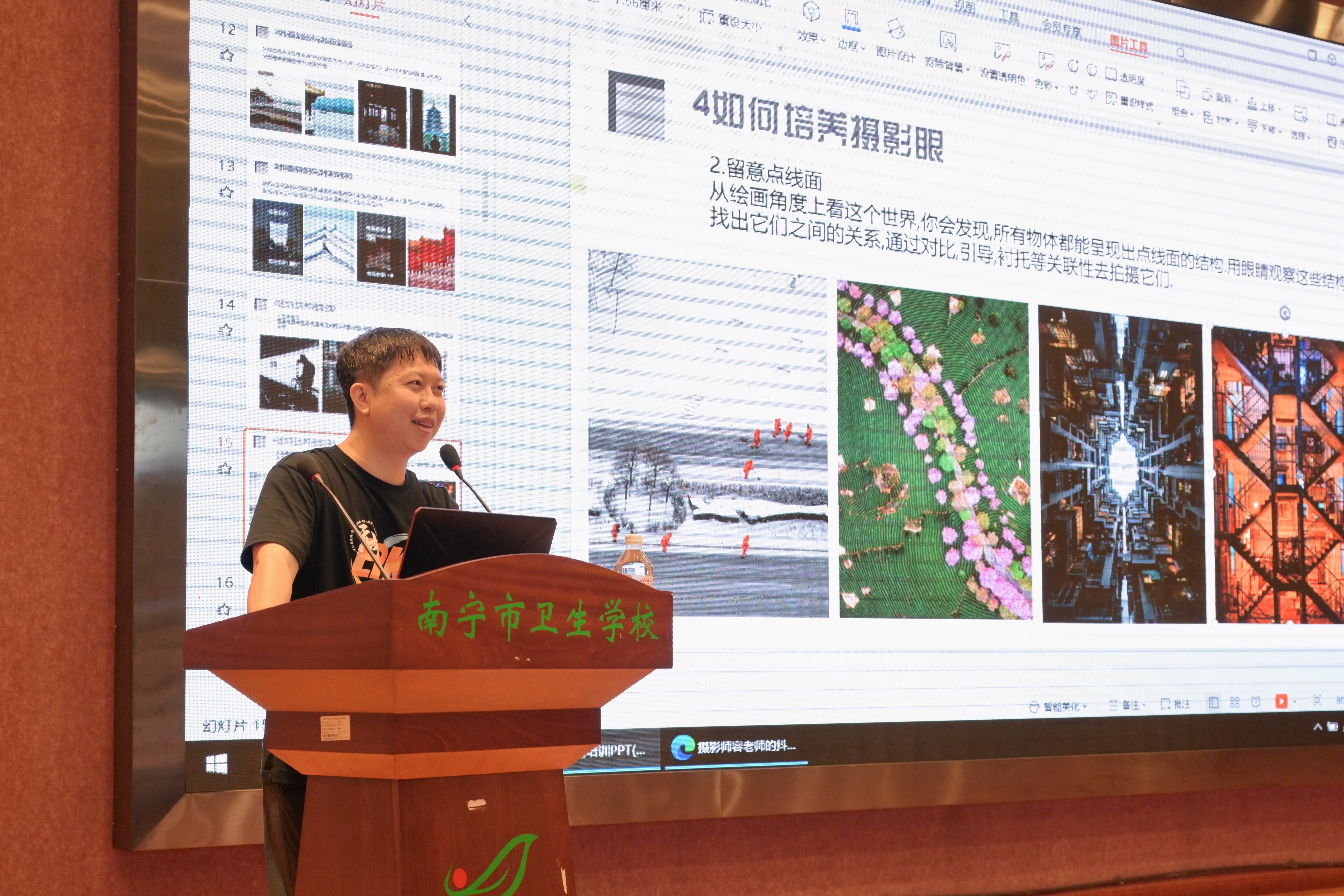 3月27日,由南宁市卫生学校灯塔读书会承办的“南卫书苑文化育人体系建设”系列活动迎来今年春学期首讲——“阅读光影·以美育人”。此次活动特别邀请著名职业摄影师容华建前来授课,他以《构图理论与手机拍照构图技巧》为主题,为现场的400多名摄影爱好者带来了一场精彩的讲座。
