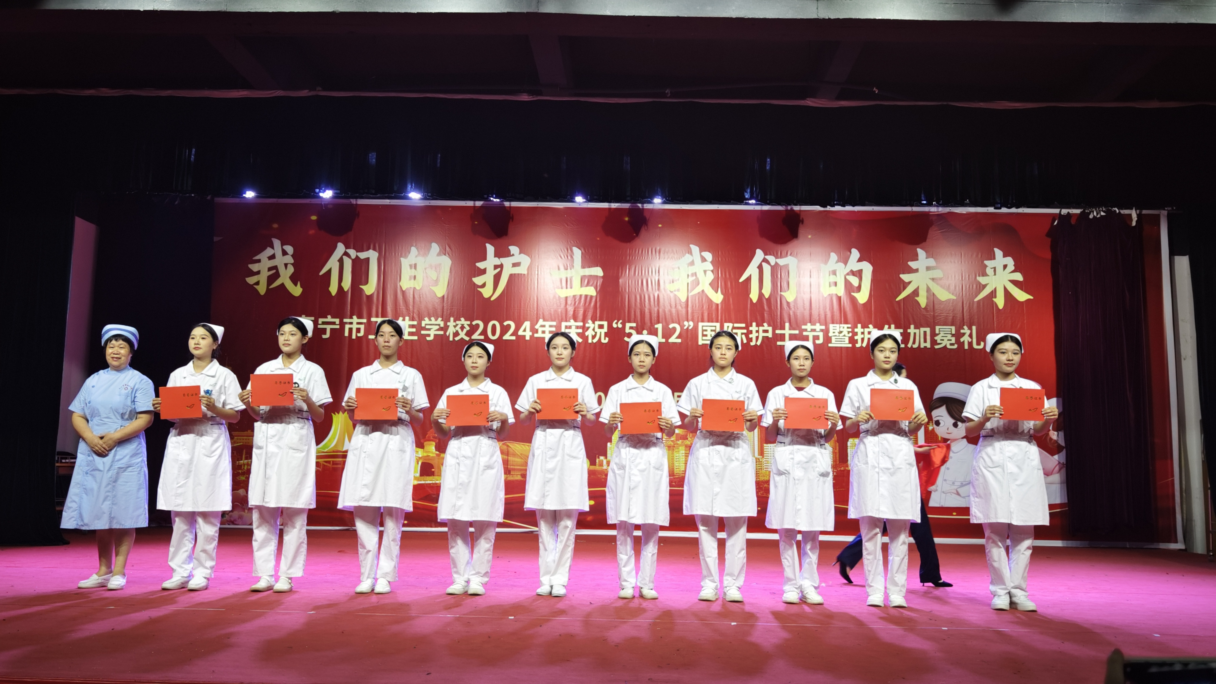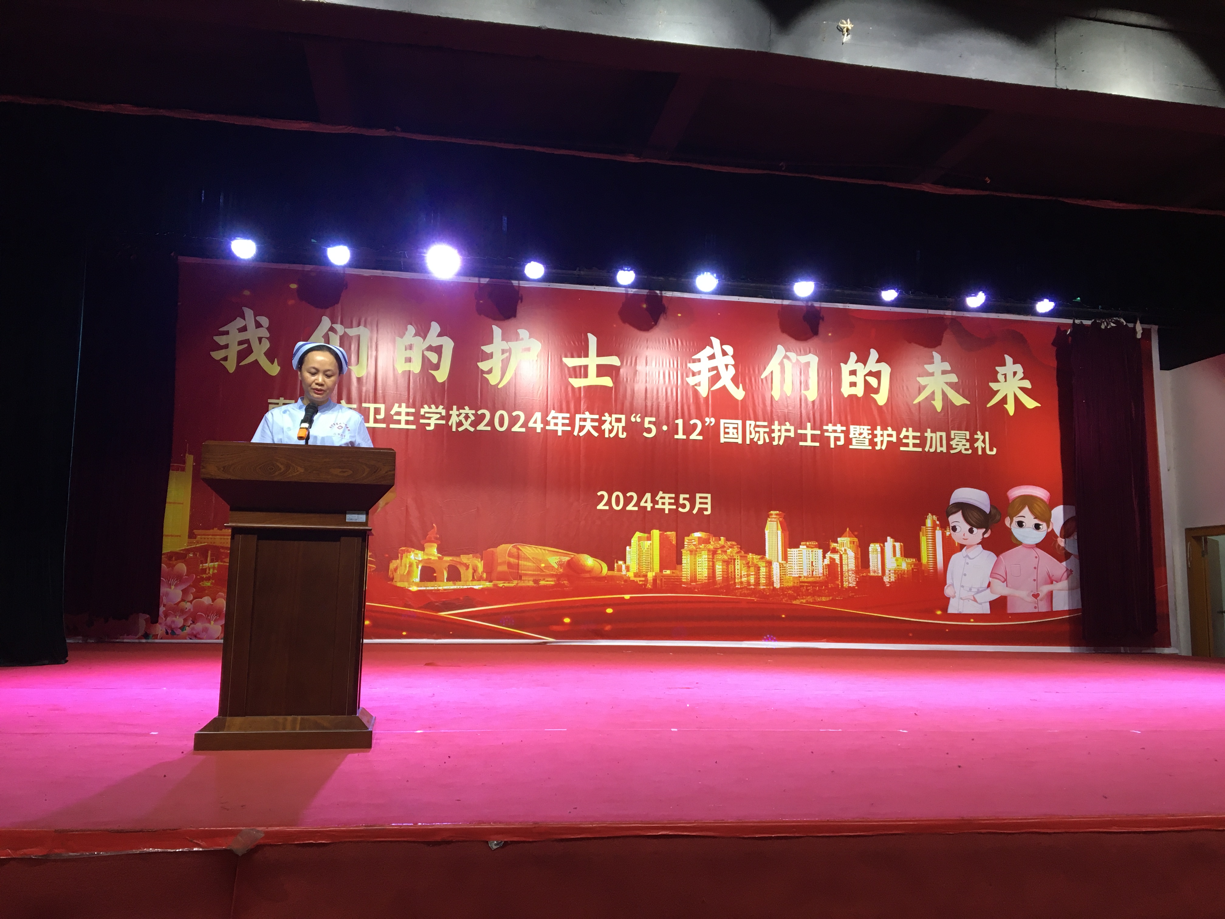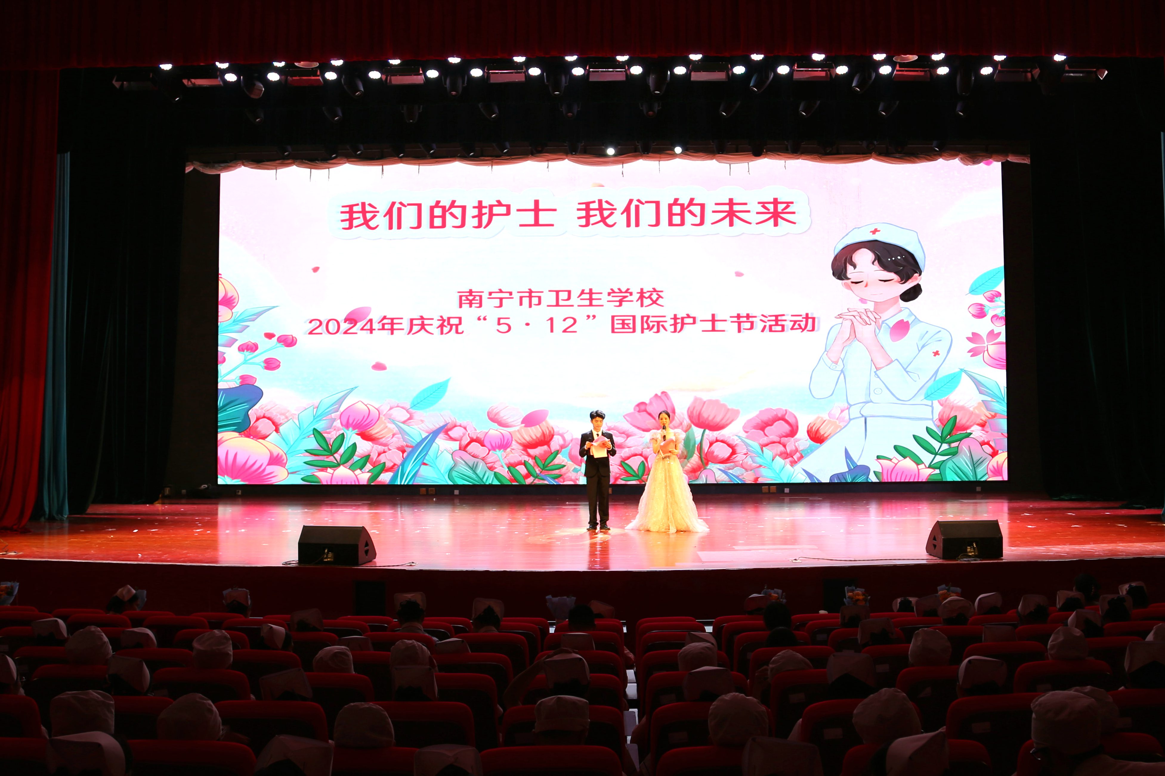 花开五月,携一缕浅夏的芬芳,凝一脂冰清玉洁的梦想。在这个芬芳的五月,又迎来了第113个国际护士节,为继承和弘扬南丁格尔不畏艰险、甘于奉献、救死扶伤、勇于献身的人道主义精神,增强护理专业学生的责任感、使命感、荣誉感,南宁市卫生学校于5月14日分别在两校区举行了5·12国际护士节活动。本次活动邀请了第45届南丁格尔奖、国家白求恩奖章、全国五一劳动奖章获得者、全国“最美奋斗者”南宁市第四人民医院艾滋病科护士长杜丽群,还邀请南宁市第二、四、五、六、八人民医院及学校附属医院(南宁市第九人民医院)的护理部主任、副主任等护理专家出席活动,学校相关领导、中层干部、护理教师及2023级护理专业学生参加本次活动。