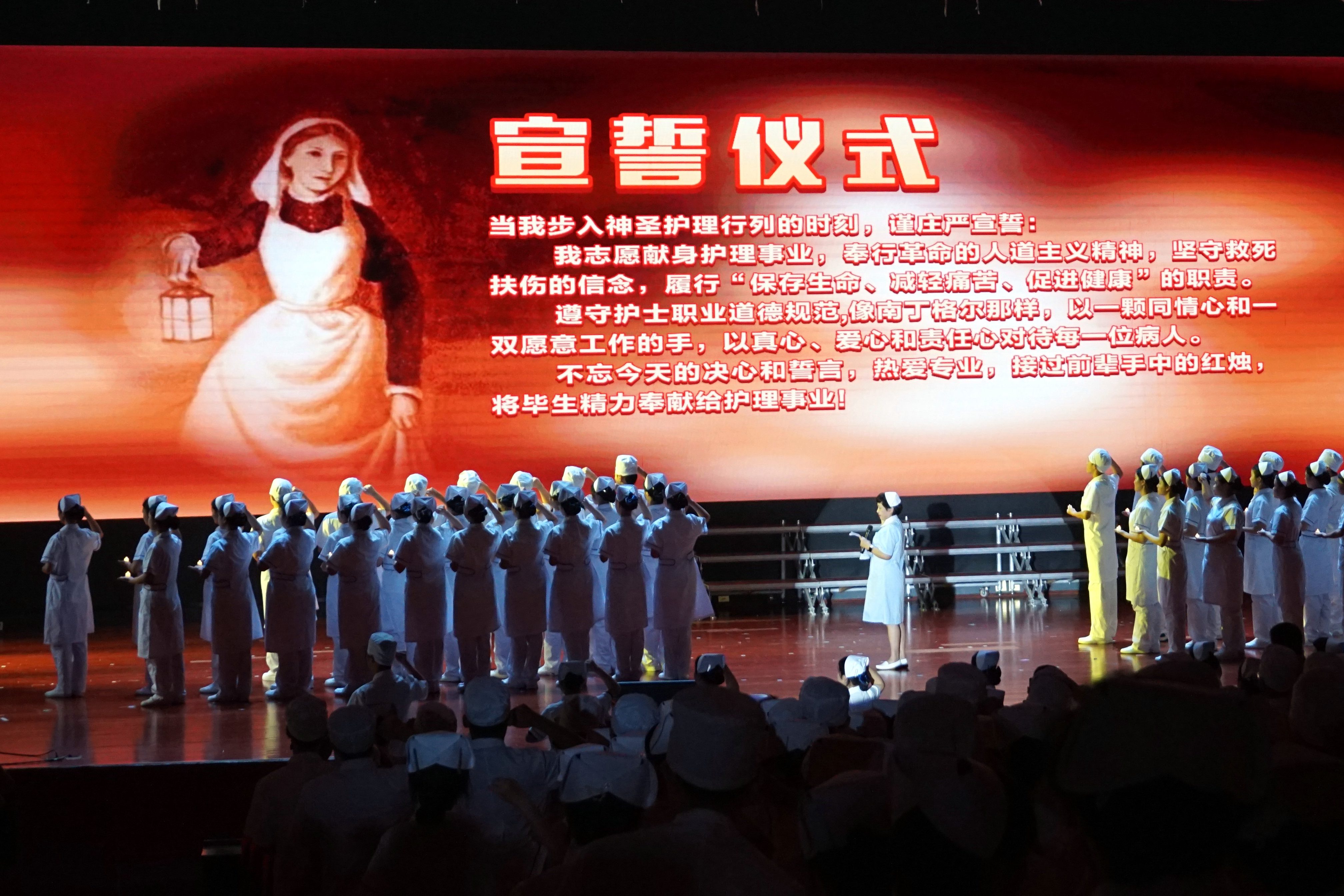 点燃天使红烛梦,传承百年护理情。伴随着庄严的乐曲响起,授帽仪式正式开始,护理前辈和专家们为护生们戴上圣洁的燕尾帽,并将手中象征着南丁格尔精神之火的红烛一一传递给护生们。全体护生手持红烛面向南丁格尔庄严宣誓,一句句掷地有声的誓言,让大家深深感受到白衣天使这个职业的崇高和光荣。