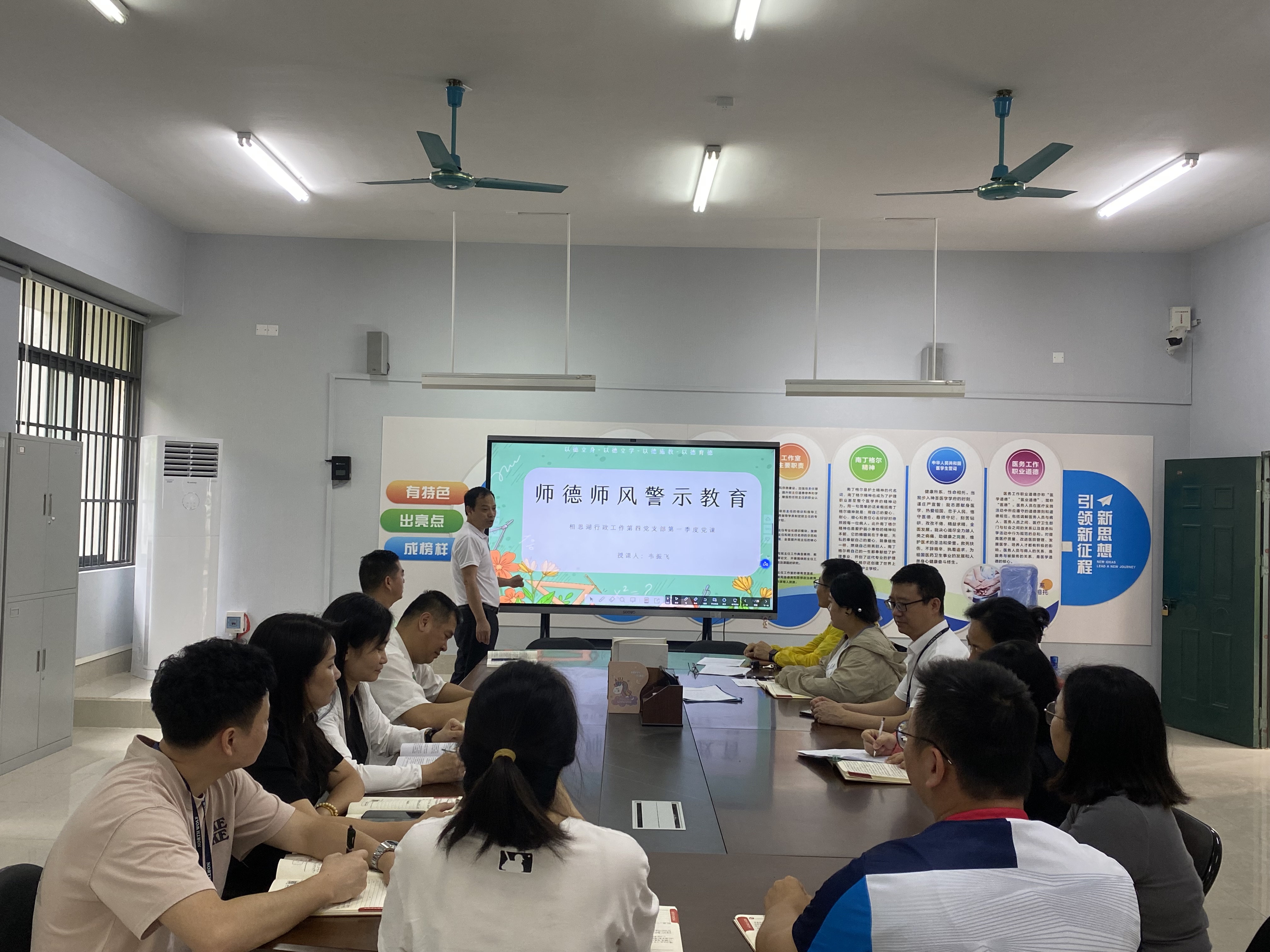 在当前教育领域不断发展和改革的背景下,教师的师德师风建设显得尤为重要。为进一步鼓励支部党员教师争做“四有”好老师、当好“四个引路人”,充分发挥党员教师先锋模范作用,5月16日下午,南宁市卫生学校相思湖校区行政工作第四党支部书记韦振飞以“师德师风警示教育”为主题,为支部党员上了第一季度党课。