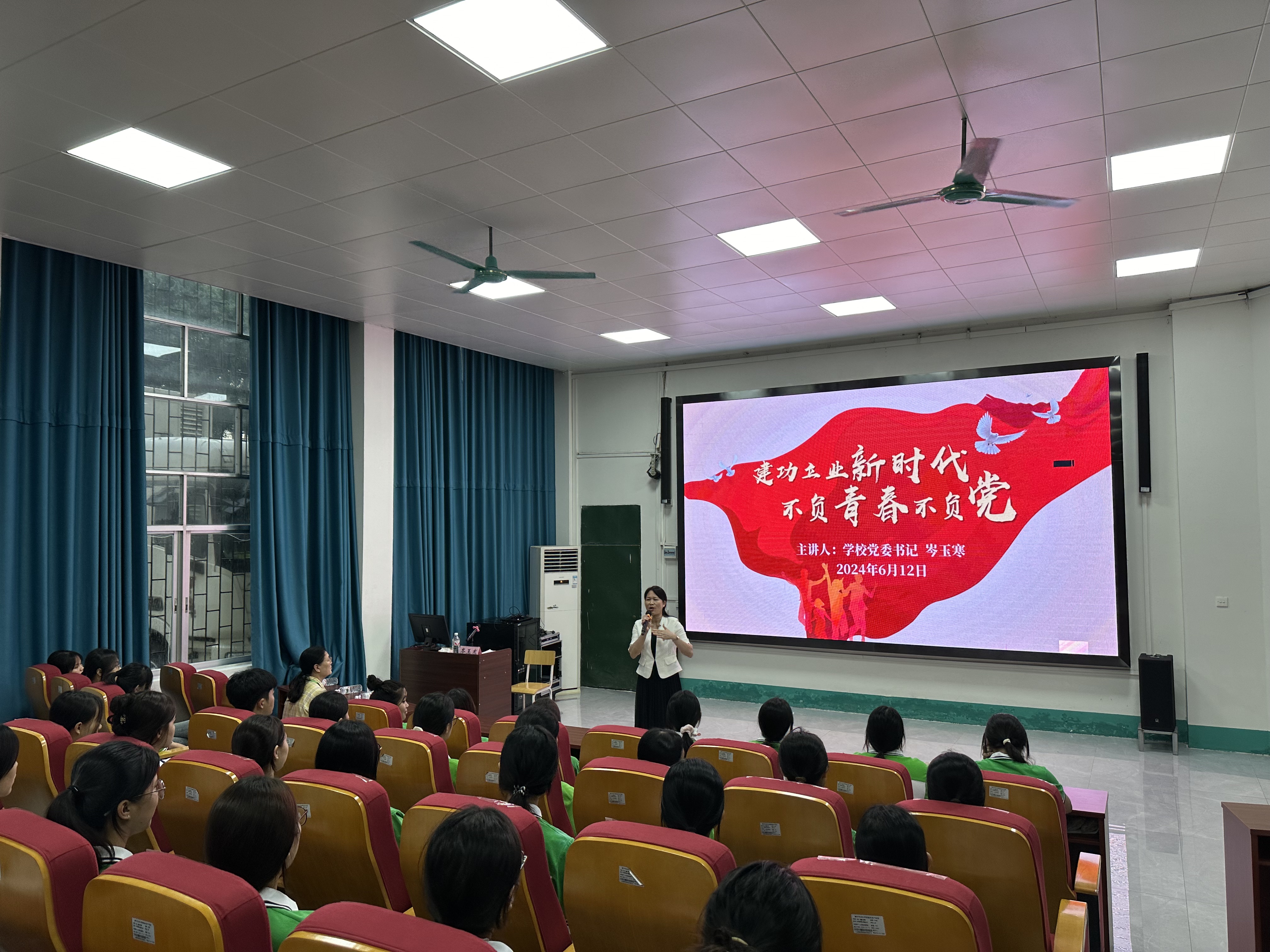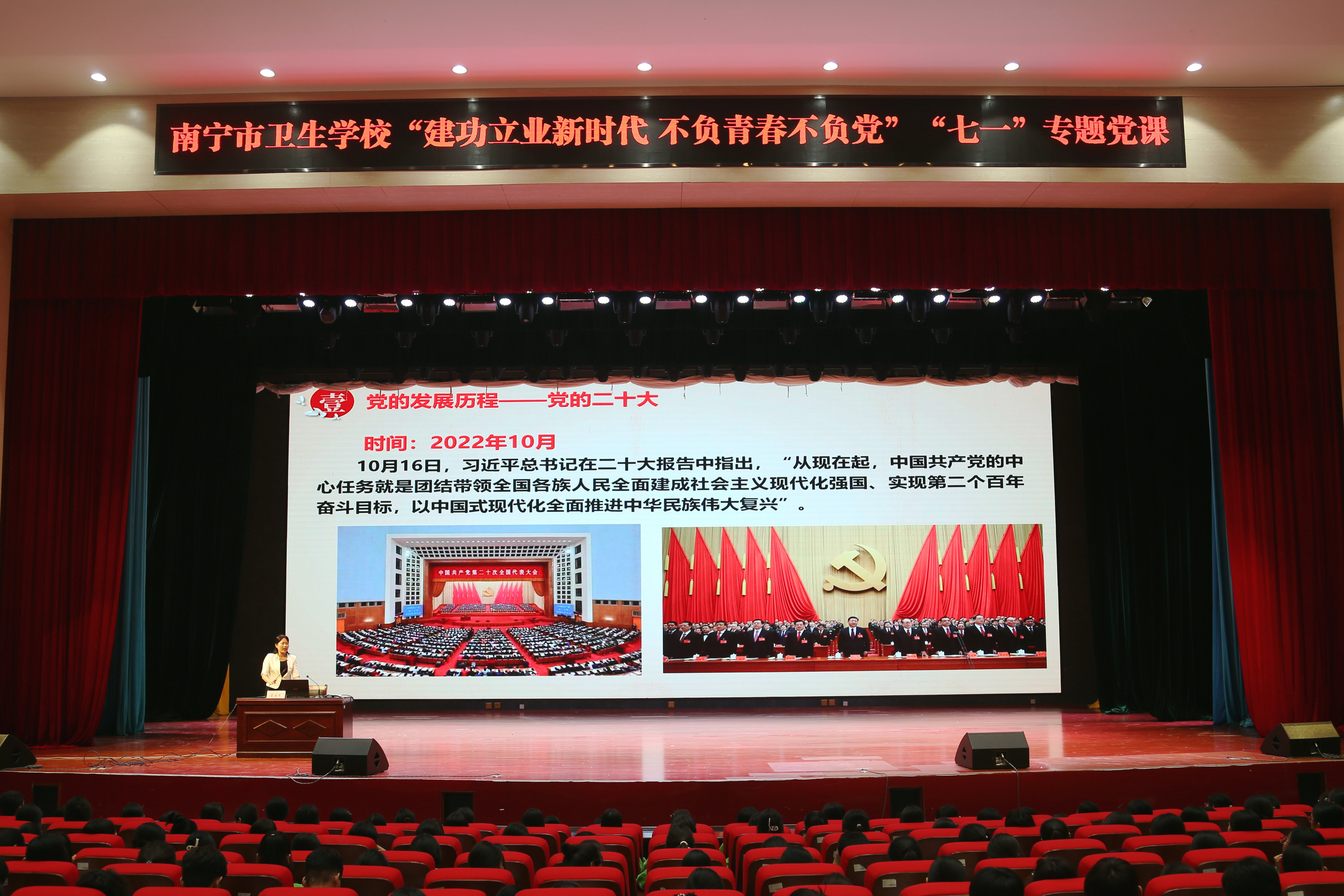 为强化青年学生思想引领,充分发挥党建带团建的作用。值此“七一”建党节来临之际,南宁市卫生学校党委书记岑玉寒以“建功立业新时代 不负青春不负党”为题,为两校区近900余名青年学生讲授专题党课。