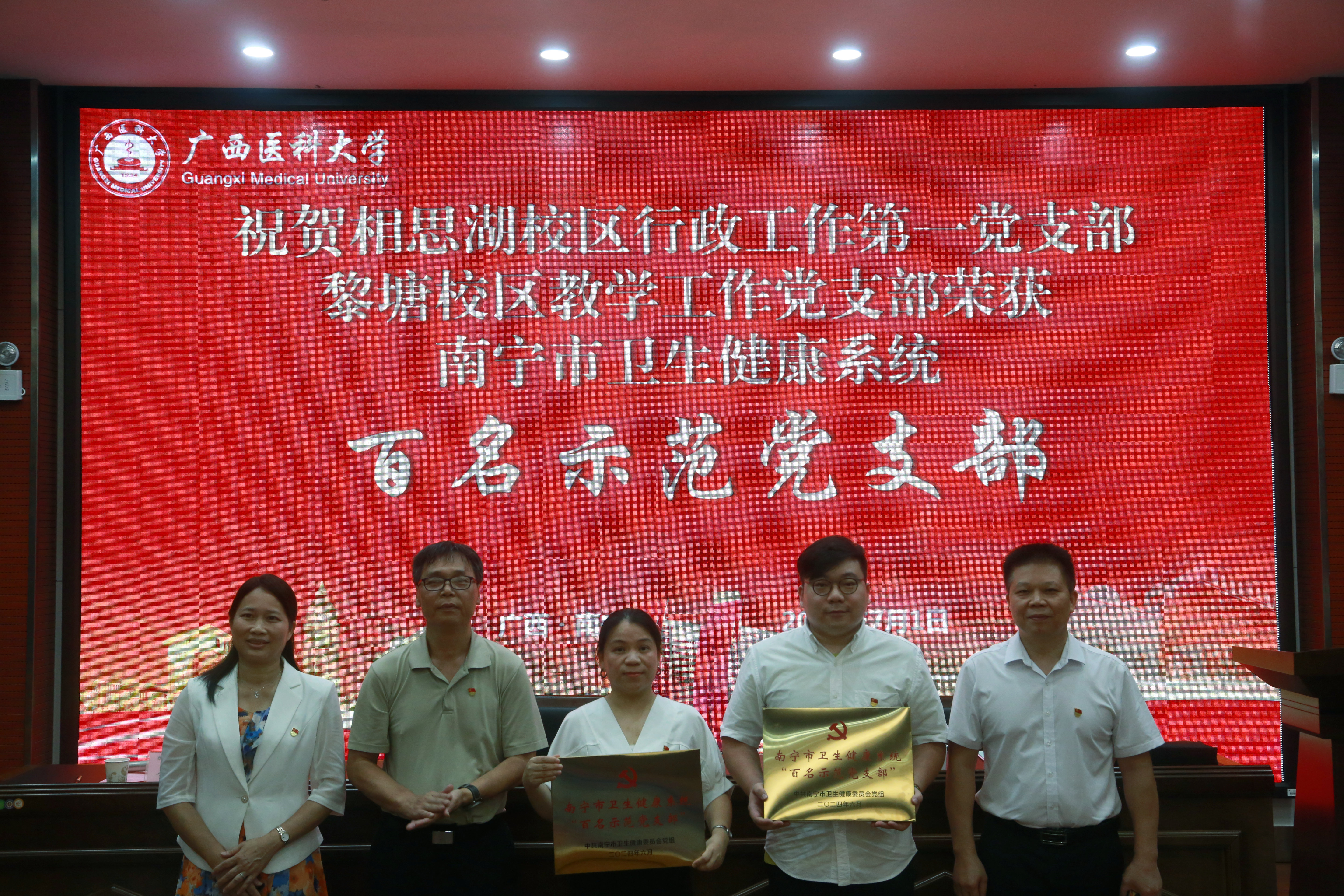 近期,学校相思湖校区行政工作第一党支部、黎塘校区教学工作党支部获评为第二批南宁市卫生健康系统“百名示范党支部”。在培训班结业仪式上,市卫健委党组成员、四级调研员许明河为两个支部颁发南宁市卫生健康系统“百名示范支部”荣誉牌匾,营造学习先进、崇尚先进、争当先进的浓厚氛围,激励学校各党支部建强战斗堡垒,凝心聚力,创先争优。