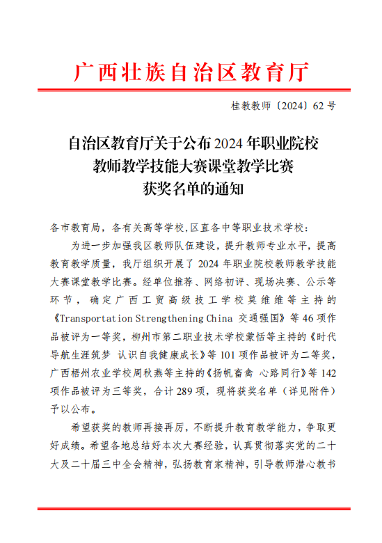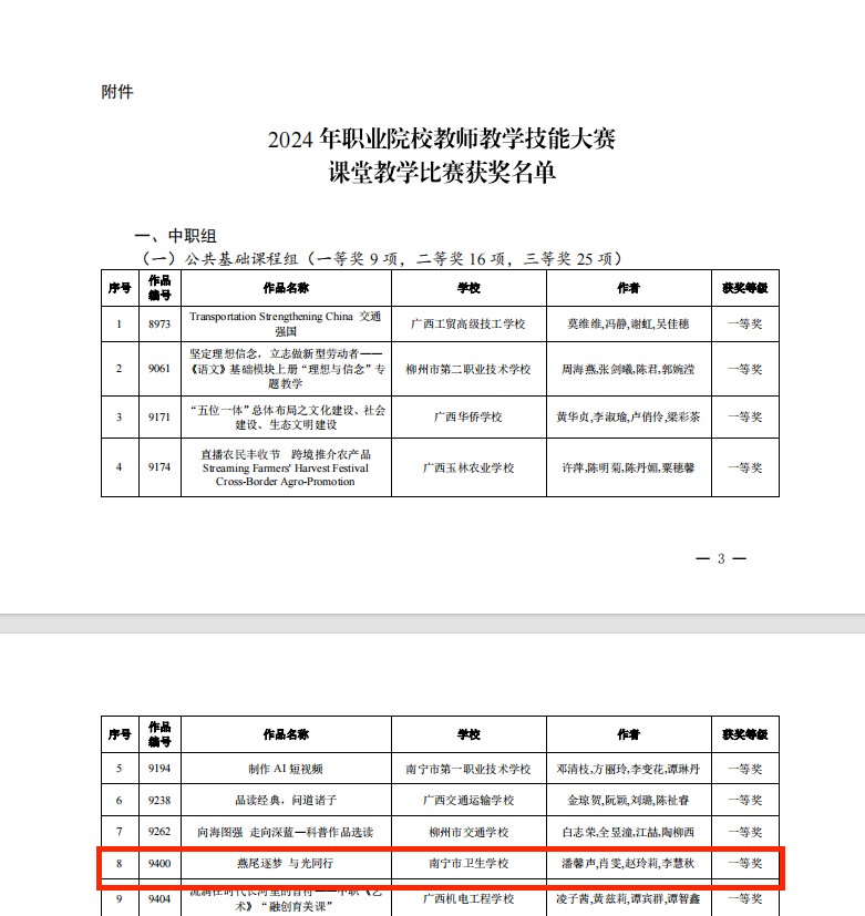在2024年广西职业院校教师教学技能大赛课堂教学比赛中,南宁市卫生学校潘馨声、肖雯、赵玲莉、李慧秋四位教师组成的思政课教学团队获得了公共基础课一等奖,这也是学校近年来在该赛项中的最好成绩。