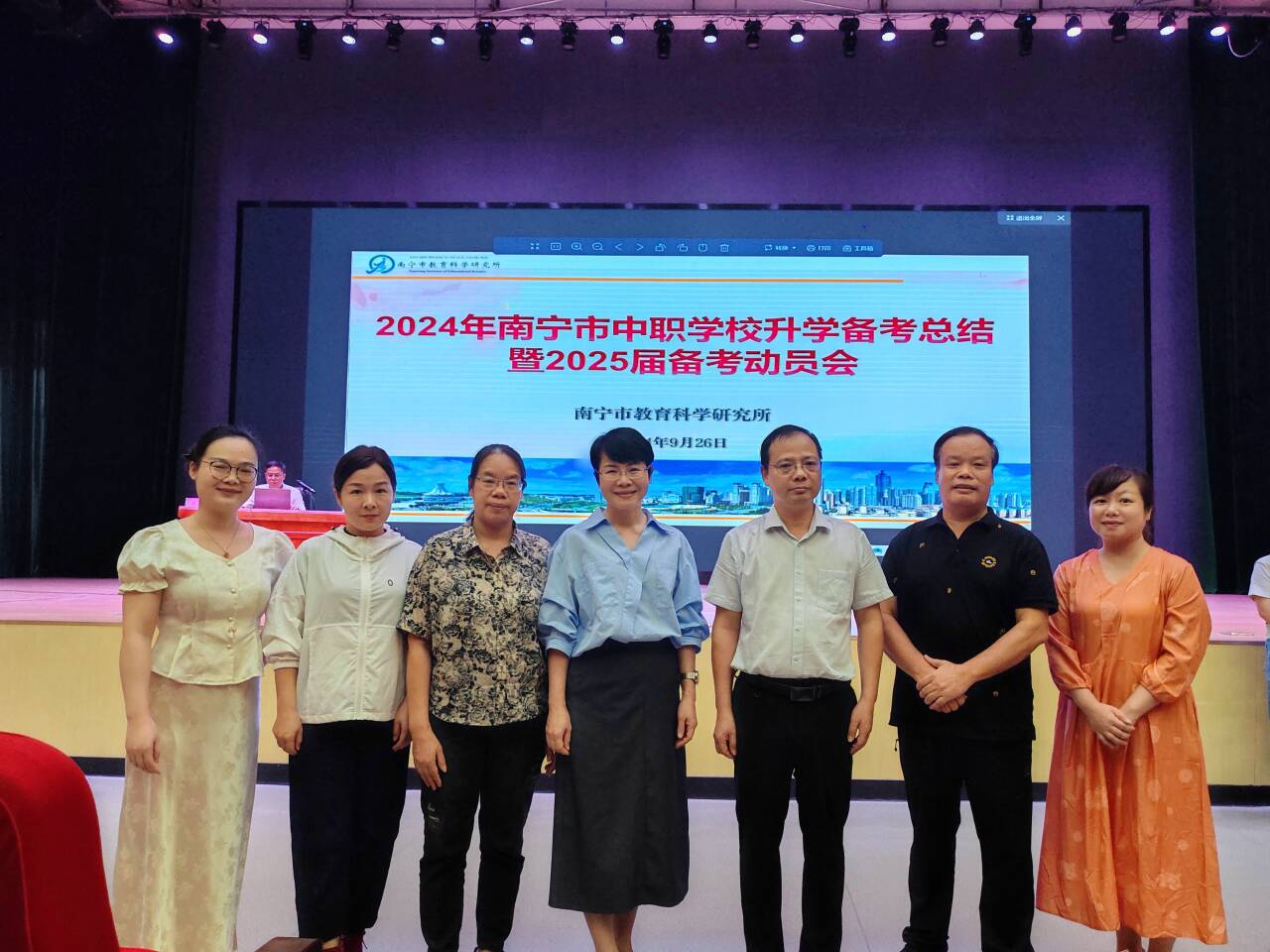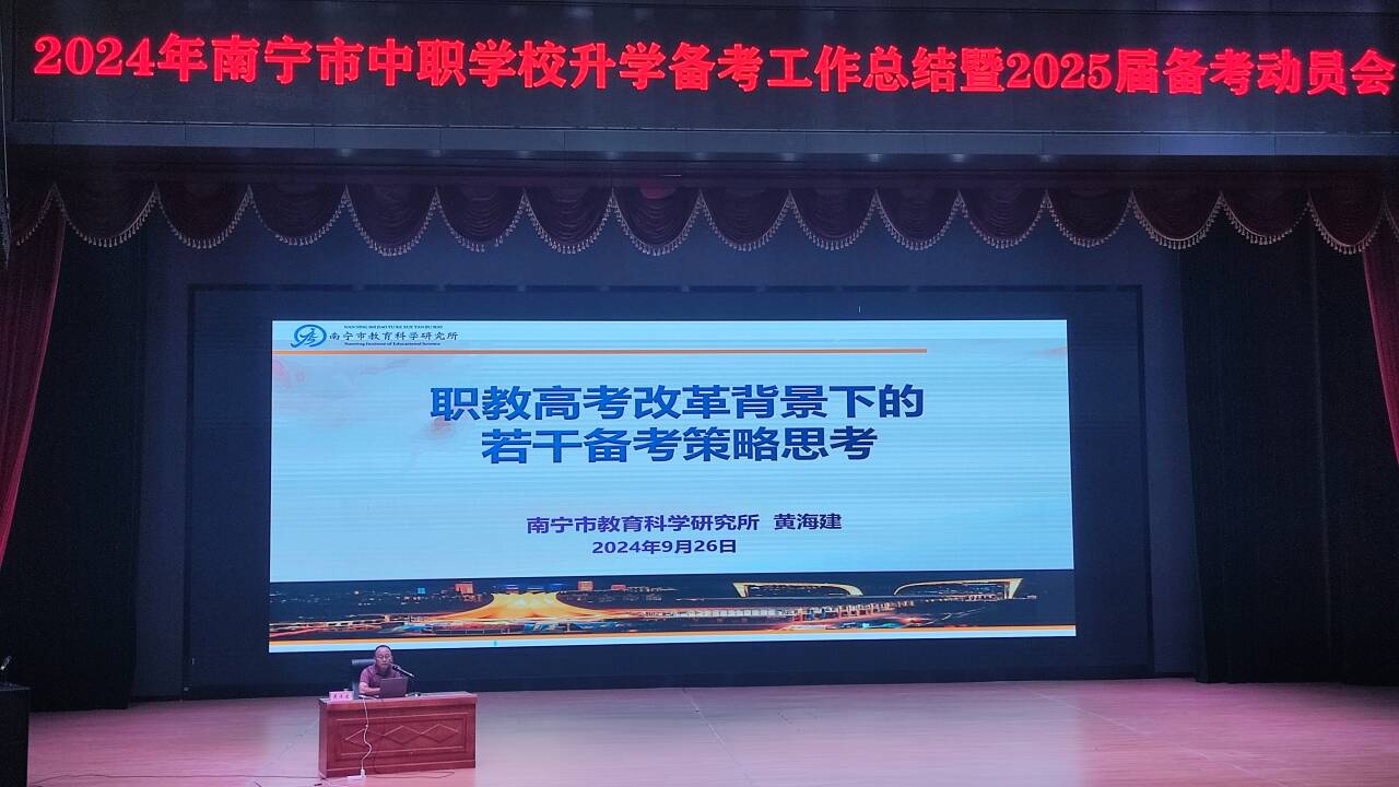 9月26日,南宁市卫生学校副校长卢青、学校教务科长韦振飞、公共课教研室主任谢秀坤及语文、数学、英语、思想政治教师一行,参加2024年南宁市中职学校升学备考总结大会暨2025届备考动员大会。此次大会由南宁市教科所主办,旨在总结过去一年中职升学备考工作经验成效,吹响新一年备考号角。