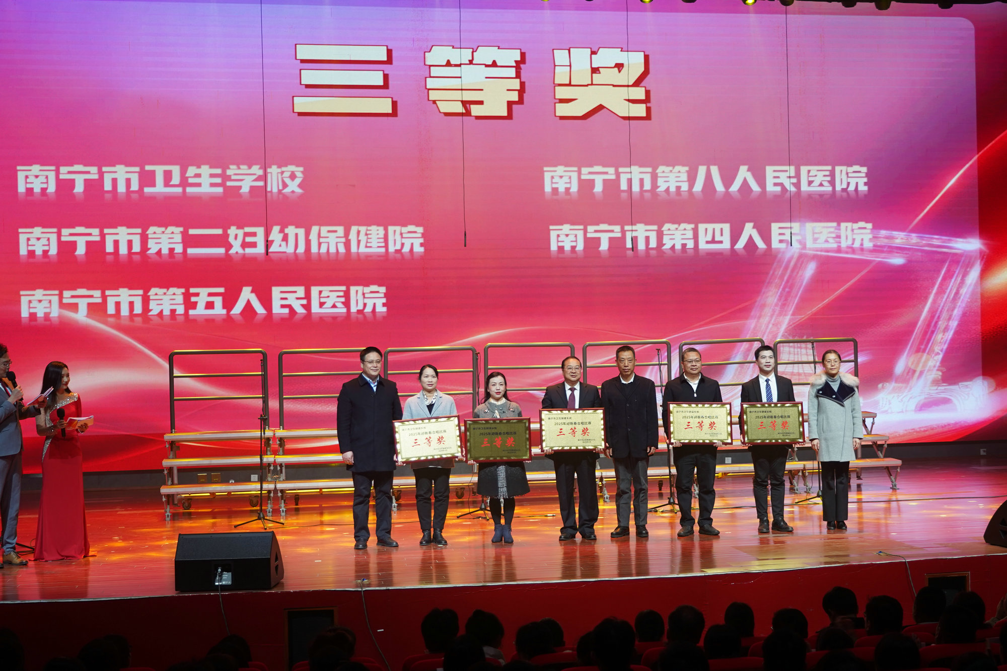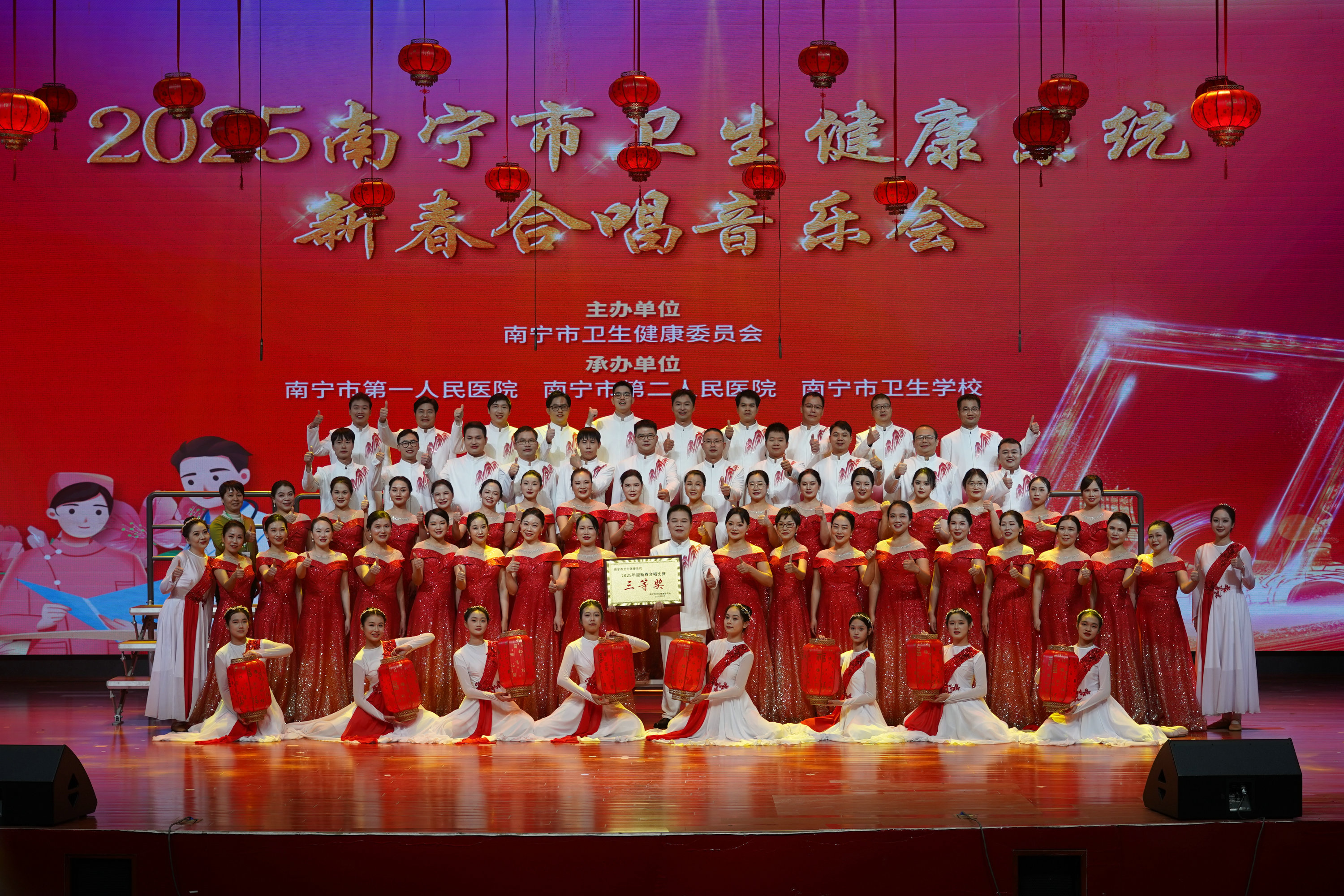 1月12日,2025南宁市卫生健康系统新春合唱音乐会在南宁市卫生学校举行。南宁市卫生学校合唱队在市卫生健康系统迎新春合唱比赛上荣获三等奖的曲目《灯火里的中国》入选音乐会表演节目。新年伊始,学校师生就以崭新的面貌、饱满的热情,唱响学校高质量发展的新乐章。
