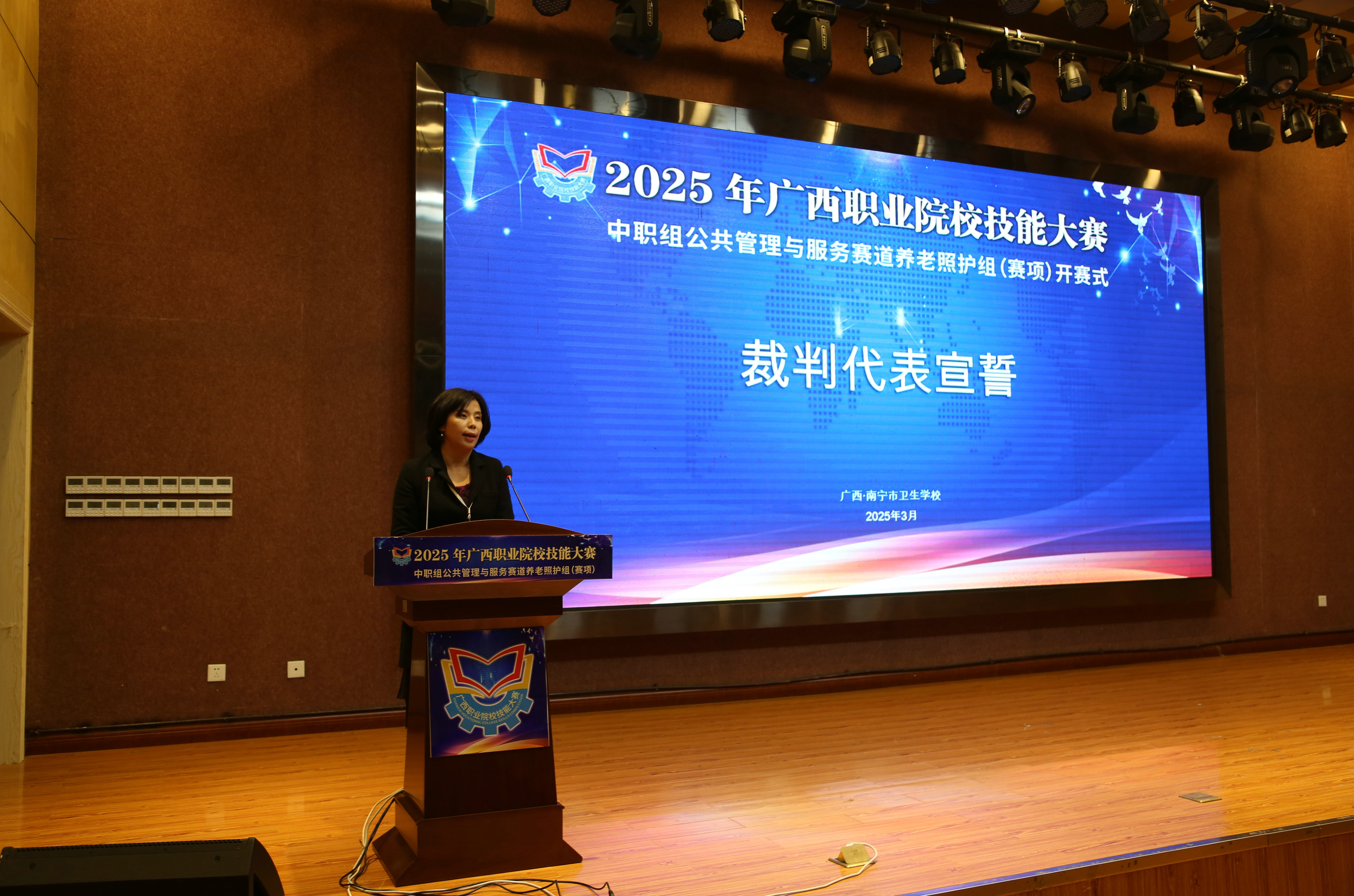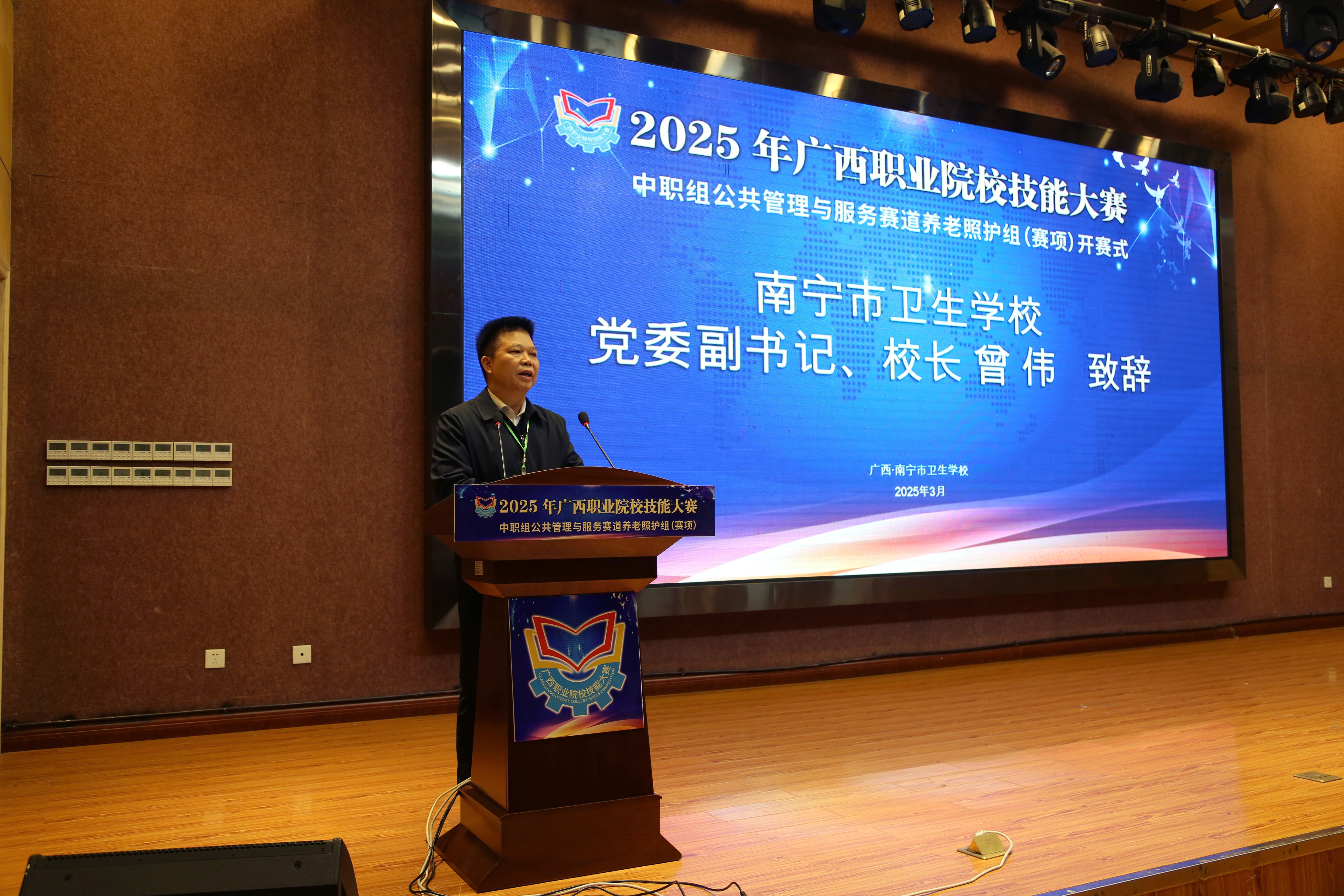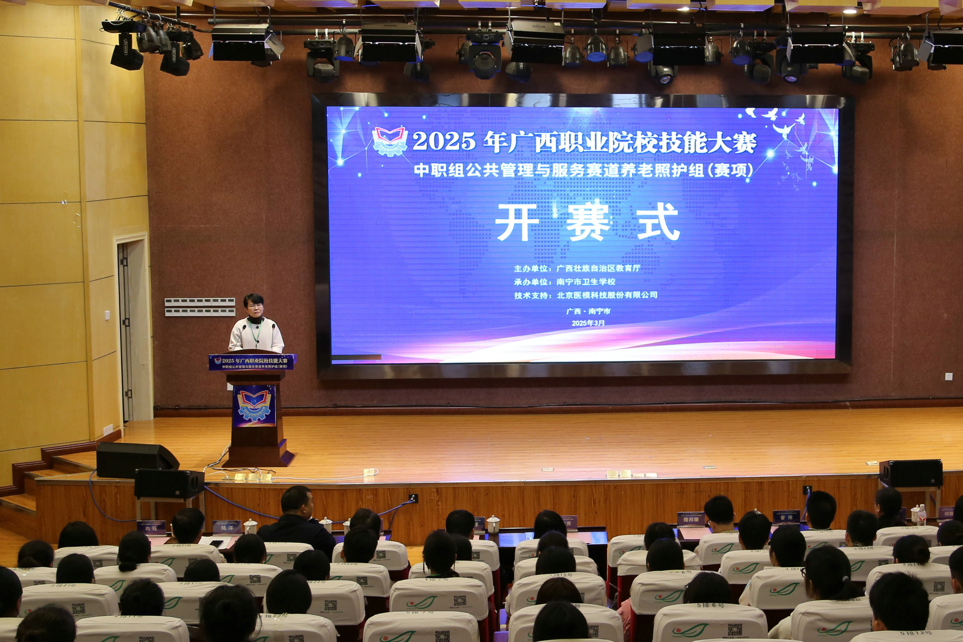 开赛式在庄严的国歌声中拉开序幕。南宁市卫生学校党委副书记、校长曾伟致欢迎辞,向参加大赛的领导、专家、裁判及参赛选手们表示热烈欢迎。他表示,聚焦“一老一小”,助力9073,是当前卫生健康服务人才培养的重点。相信通过以赛促学、赛学结合,一定能培养和选拔一批又一批的优秀养老照护人才,积极投身老龄产业和照护事业,为广西老人老有所养、老有所乐提供支撑、做好托底,让老年人的幸福生活触手可及。