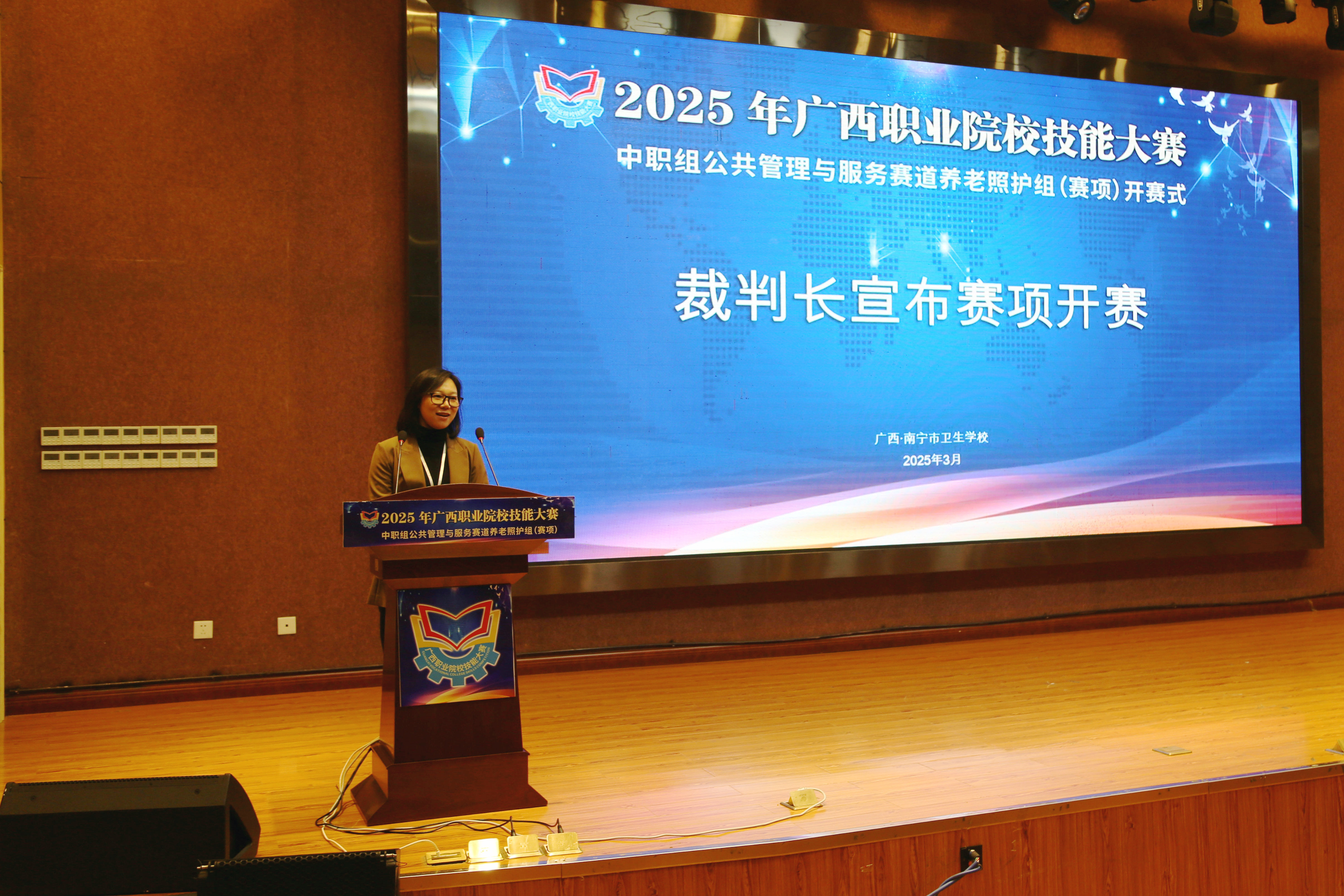 春风送暖,一派盎然。3月5日上午,2025年广西职业院校技能大赛中职组公共管理与服务赛道养老照护组(赛项)在南宁市卫生学校顺利开赛。南宁市卫生健康委员会三级调研员隆邦臻、南宁市卫生健康委员会老龄健康科科长蓝全祥,全区18所中职学校带队领导、指导老师及68名选手参加开赛式。开赛式由南宁市卫生学校副校长卢青主持。