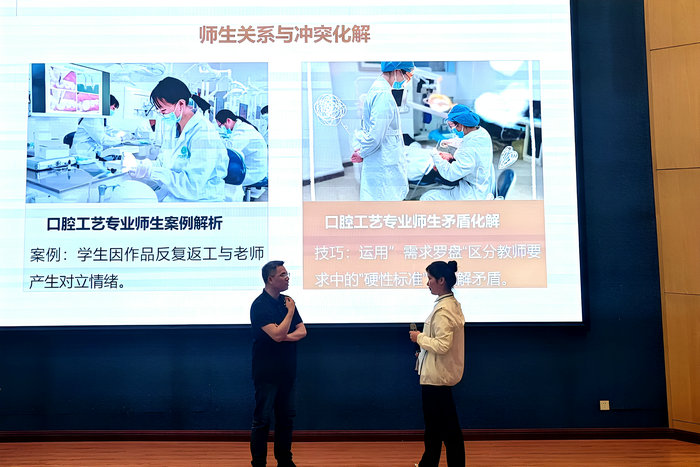 在“解锁人际密码”环节,针对不同场景的人际矛盾,讲座提供了具体解决方案,针对同辈关系:采用“三明治沟通法”(肯定+建议+鼓励)化解冲突;针对师生关系:运用“需求罗盘”区分教师要求的“硬性标准”与“弹性空间”,结合“延迟反应法”管理情绪;针对专业学习场景:护理、口腔工艺等专业学生需掌握“职业距离三原则”。