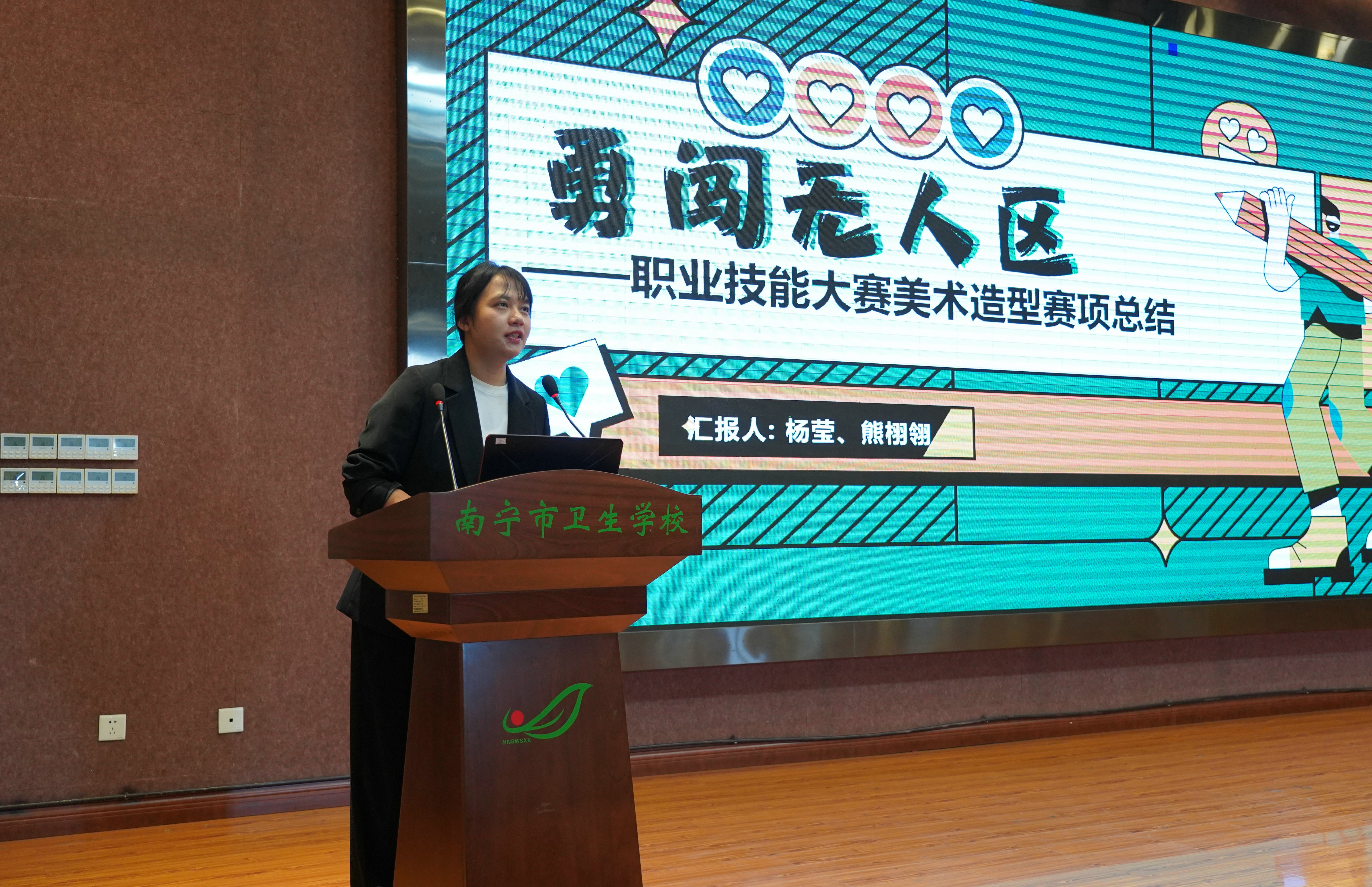 会议伊始,参加 2025 年广西职业院校技能大赛的各参赛队负责人依次上台,分享了他们在比赛中的宝贵经验。《美术造型》赛项团队深入了解行业前沿趋势与市场需求,将学校的医学特色和广西本地的壮族元素相结合,以此为依据确定创作主题确保作品既具创新性,又能契合行业实际应用。在备赛过程中,团队成员不仅钻研专业知识技能,还培养对艺术的执着追求与创新精神,日夜打磨作品;在面对挑战时积极沟通、相互协作,提升综合素养。他们在整个备赛与比赛过程中展现出的专业能力与职业态度,赢得了在场师生的阵阵掌声。