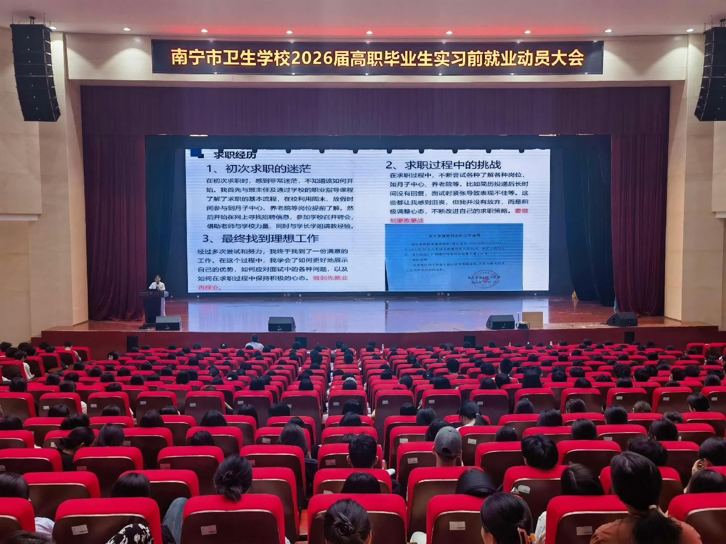 2025年5月13日上午,南宁市卫生学校学生活动中心内气氛活跃,一场为2026届高职毕业生精心筹备的实习前就业动员会在此顺利举行,旨在为同学们即将开启的实习与就业之旅保驾护航,助力他们迈出走向社会的关键一步。会议由学校招生就业指导办公室黄向阳主持,通过校友分享、专家讲座和校领导动员三个环节,为同学们提供了全方位的就业指导。