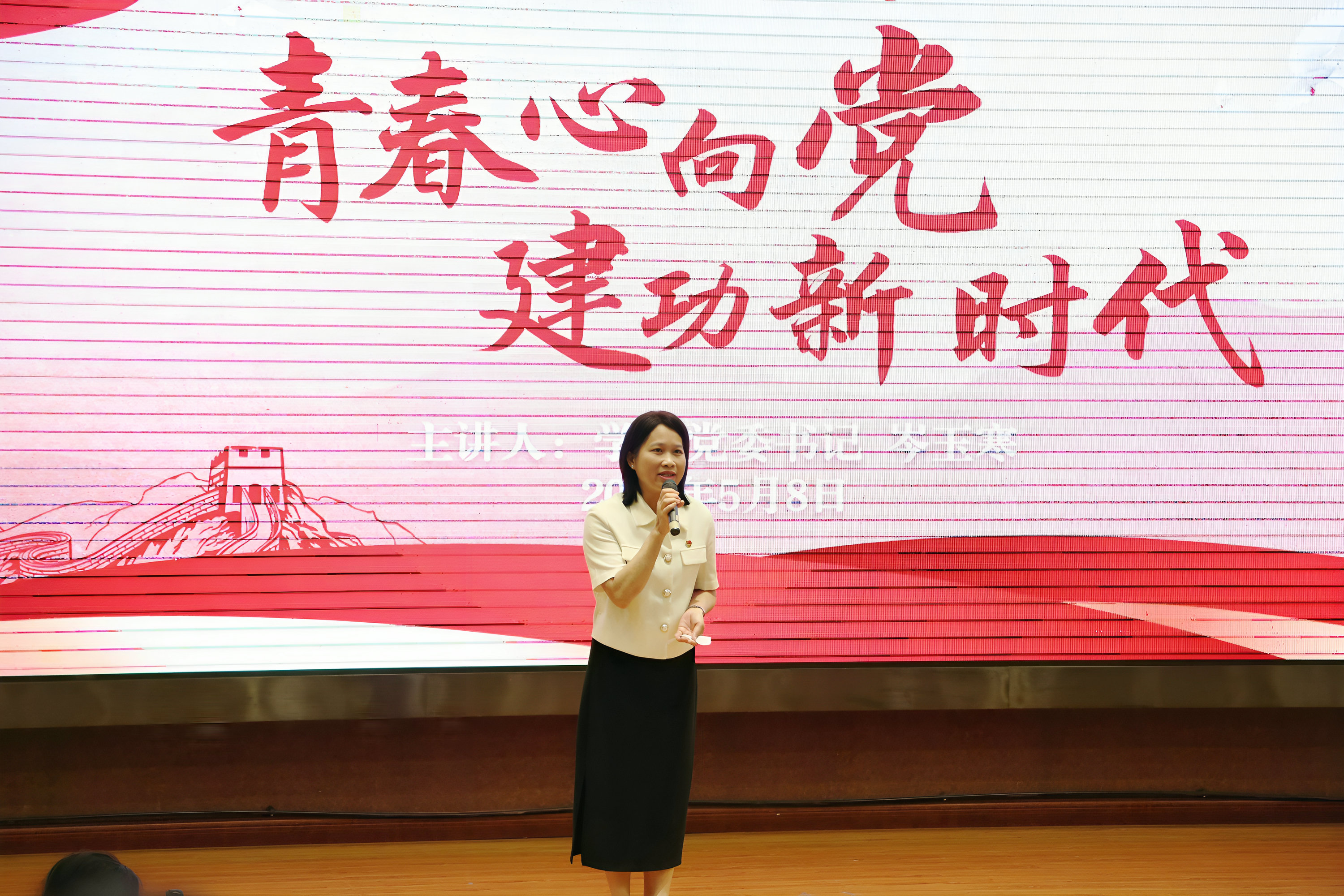 为纪念五四运动106周年,弘扬五四精神,5月8日晚,南宁市卫生学校党委书记岑玉寒以“青春心向党 建功新时代”为主题,在相思湖校区大学术报告厅通过视频同步的方式,为两校区600余名青年团员讲授专题党课。活动由学校团委副书记阮嘉良主持。