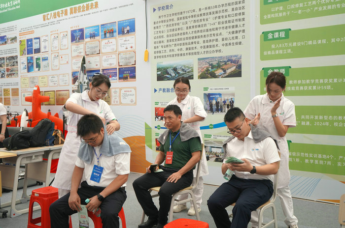 在技能展示现场,学校师生代表绘声绘色地向参观者介绍学校的专业特色和办学成果,现场开展了艾灸、拔罐和中医推拿三个项目的技能展示。这些展示吸引了众多职业院校师生和研学学生的目光,他们纷纷驻足观看和体验,并对同学们专业手法表示赞赏。