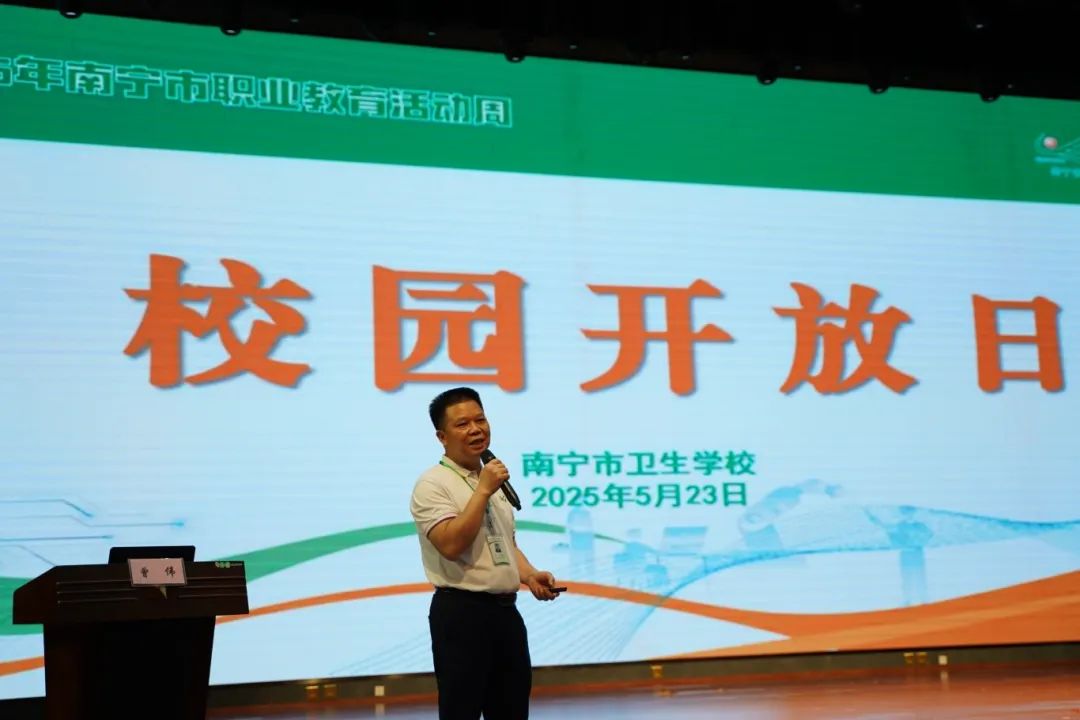 用开放拥抱未来,用技能点亮人生。5月23日下午,南宁市卫生学校举办2025年职业教育活动周“校园开放日”活动,以“成果汇报+技能展演+实训观摩”三位一体模式,集中展示学校的办学特色与成效。来自南宁市西乡塘区、隆安县、高新区及市直属初中的百余名校领导到场观摩,学校党委副书记、校长曾伟,副校长卢青参与接待。