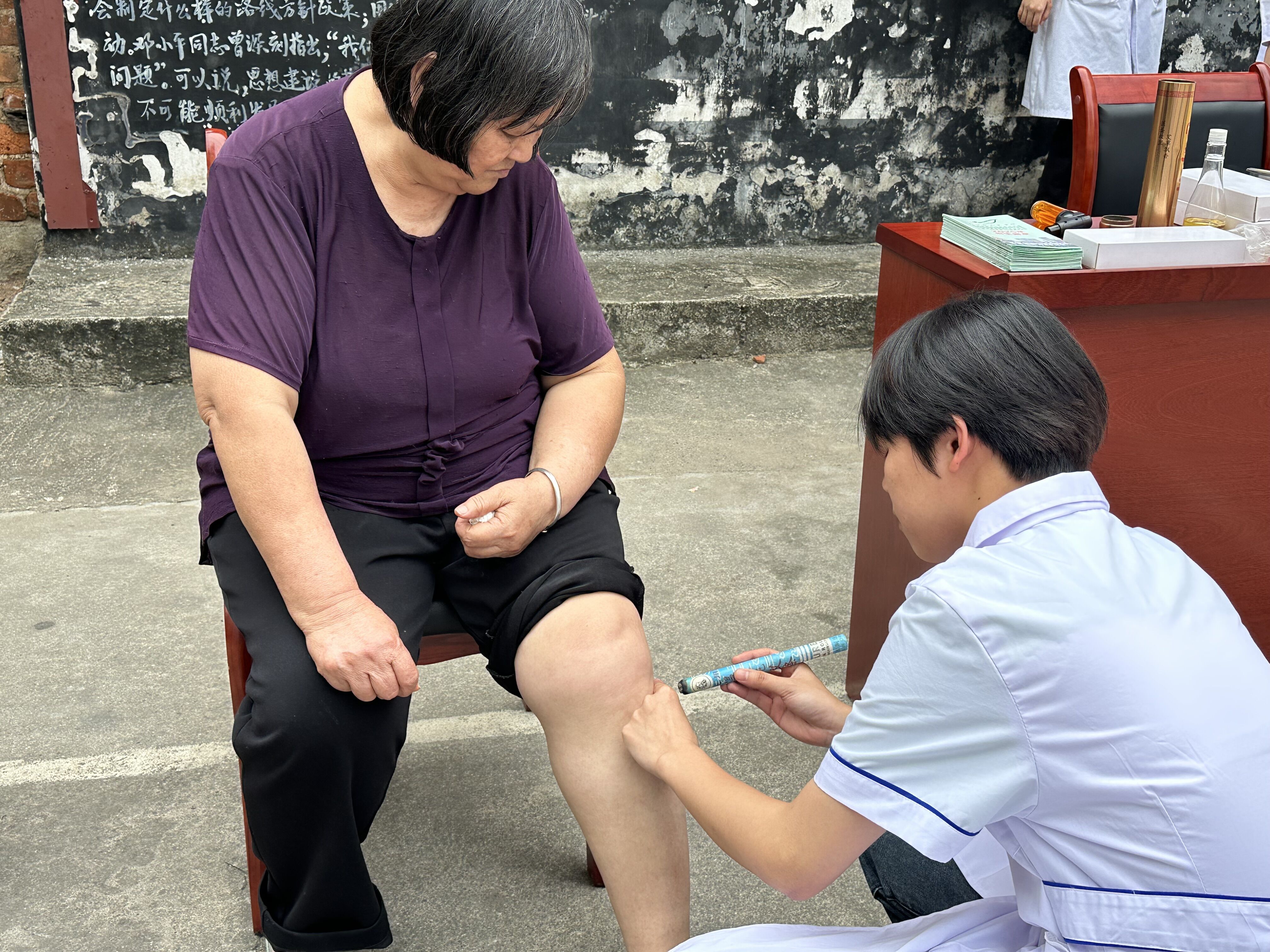 推拿按摩展位前,学生志愿者在专业教师的指导下,正为肩颈部酸痛的老人施展“手法魔术”,一边精准按压肩颈穴,一边耐心讲解日常保健知识。艾灸刮痧展位飘来淡淡艾香,志愿者们根据居民体质辩证施护:为湿气重的居民进行穴位艾灸,为肩颈痛的居民进行刮痧。