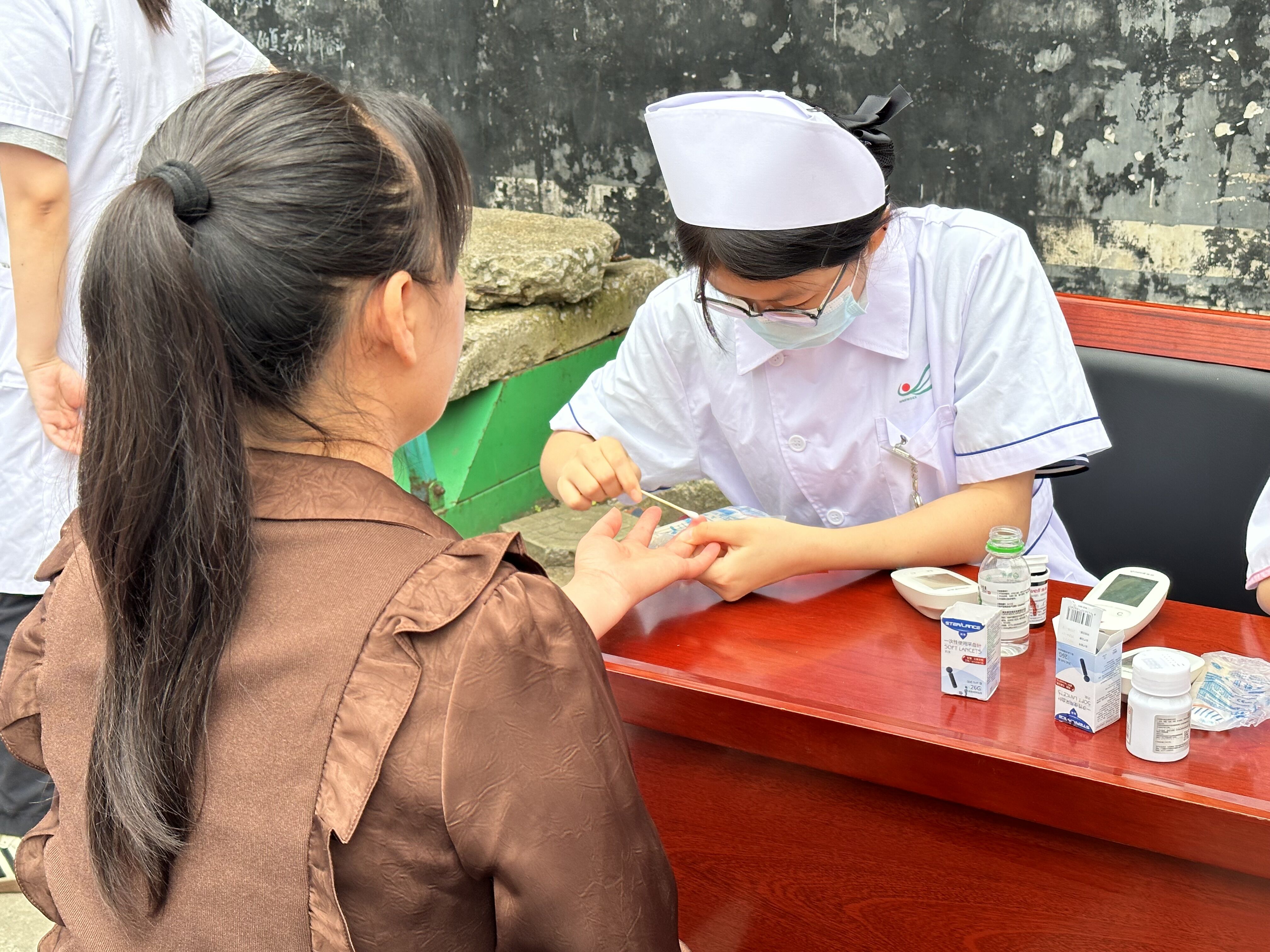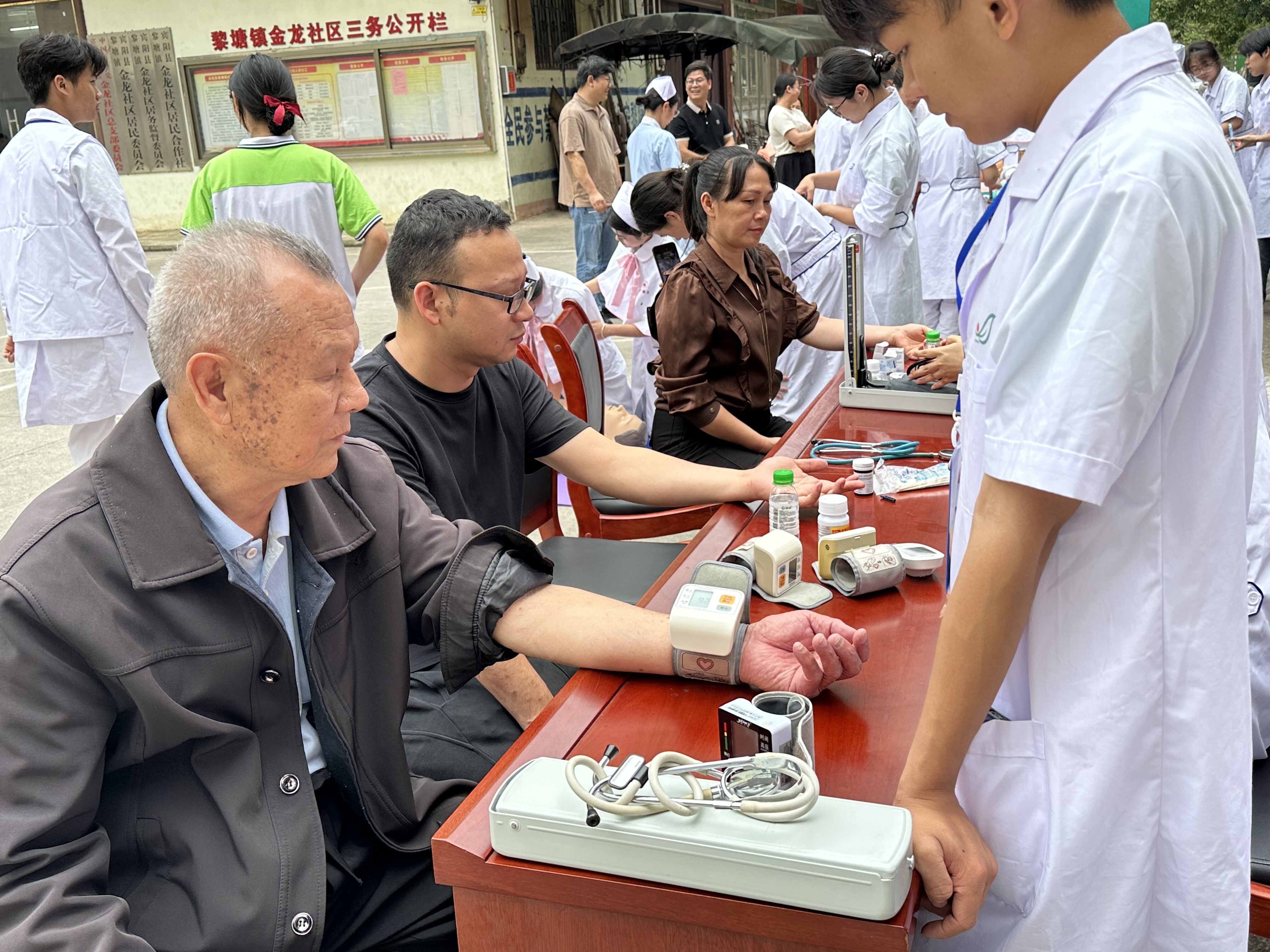 血压血糖测量区前排起长队,师生们为每位居民建立“健康小档案”,为血压异常的居民标注随访时间。75岁的张爷爷感慨:“不用去医院就能免费测血糖血压,还能得到健康宣教指导,太方便了!”