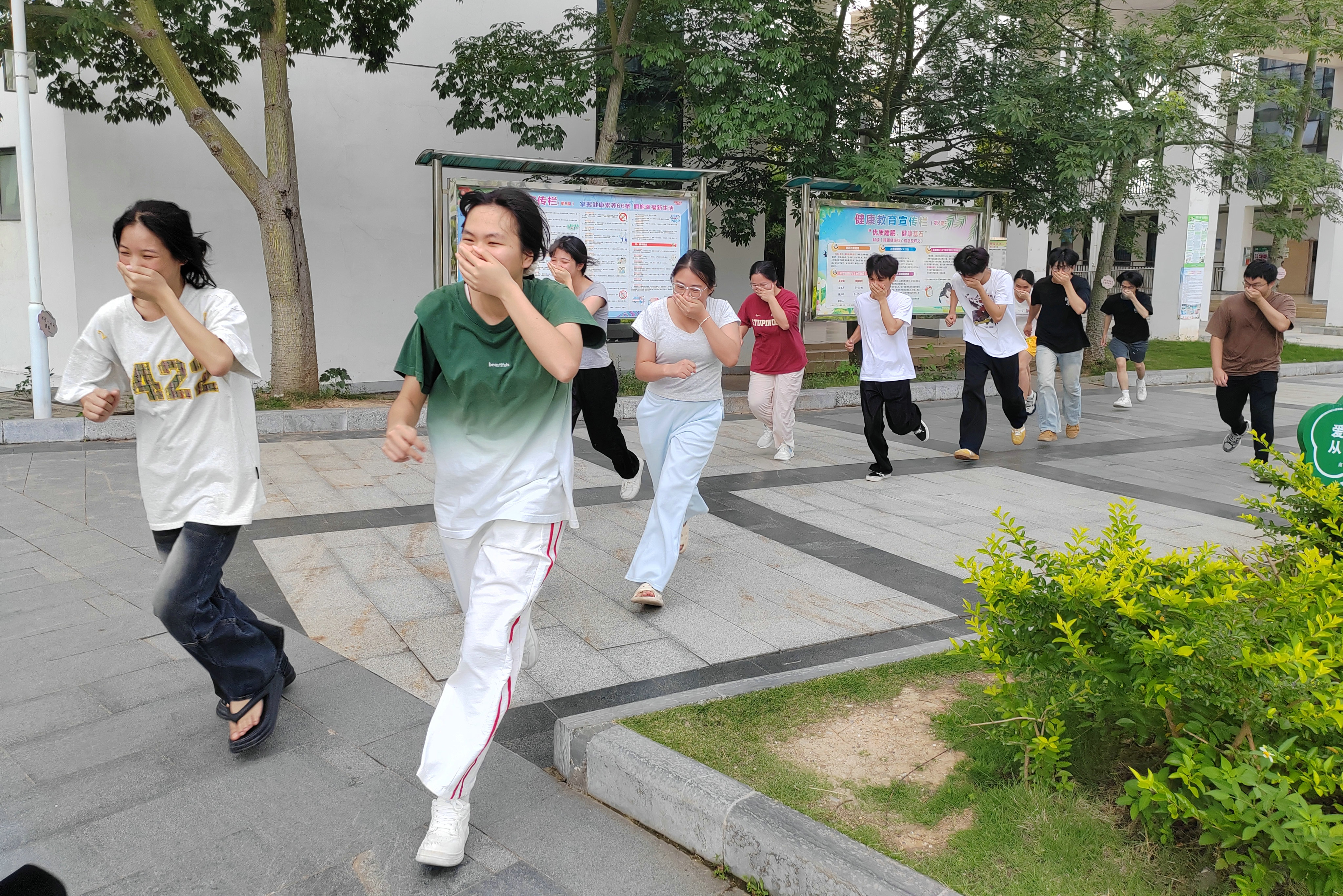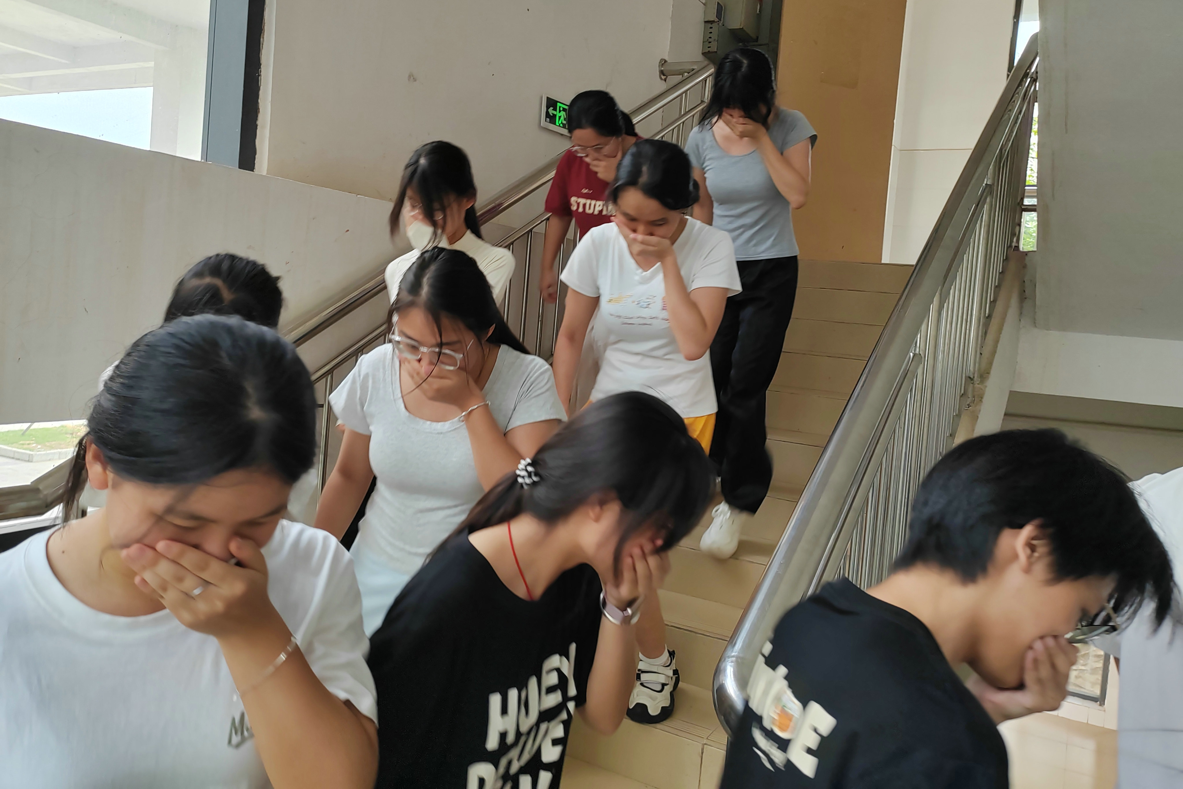 上午9:50警报响起,教学楼A2全体师生按照预定疏散路线,从东、中、西三个楼梯迅速撤离。各楼层安全疏导员严格维持秩序,引导学生单人单排靠两侧下楼,避免拥挤。师生们沉着冷静,全部安全撤离至图书综合楼前集合点,并整齐列队,全程未发生推挤、踩踏等意外情况。