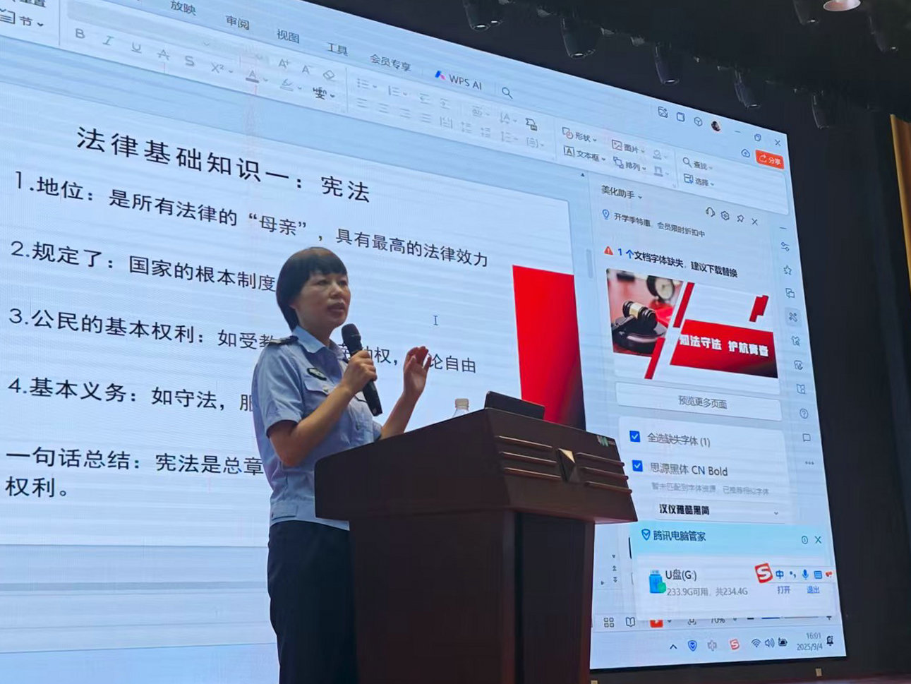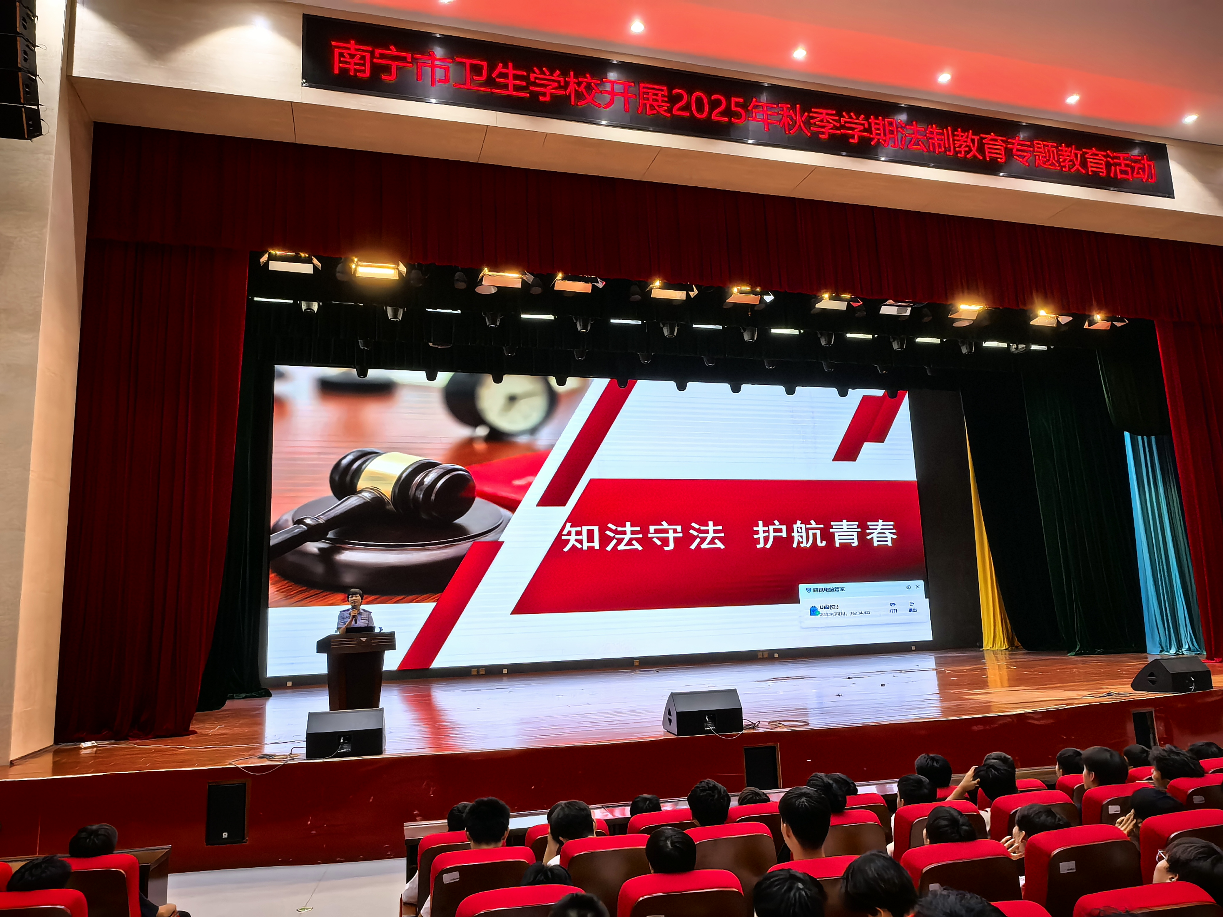 为持续增强学生法治意识,筑牢校园安全防线,9月4日下午,南宁市卫生学校特邀广西第三强制隔离戒毒所教育大队副大队长、一级警长、学校法治副校长黄志海走进校园,开展以“知法守法 护航青春”为主题的法治教育专题讲座。