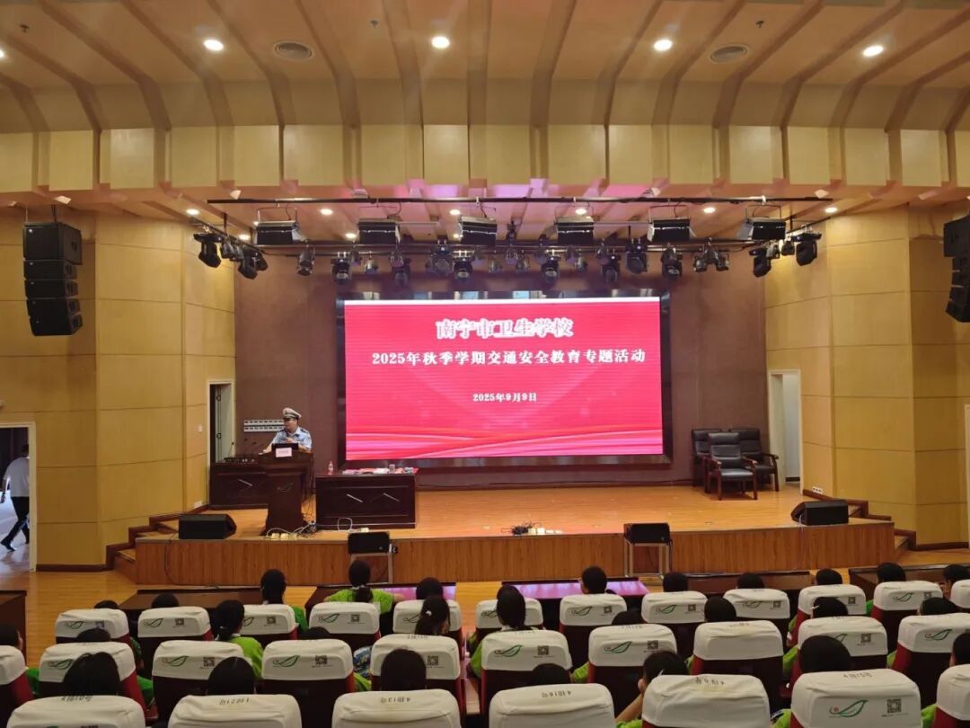 为增强广大师生交通安全意识,提升自我防护能力,有效预防交通事故发生,9月9日下午,南宁市卫生学校邀请了南宁市交警支队交通安全宣讲团教官、南宁交警八大队副班长李斐振警官到校,为2025级新生开展了一场生动有趣的“知危险 会避险——交通安全进学校”主题宣传教育讲座。