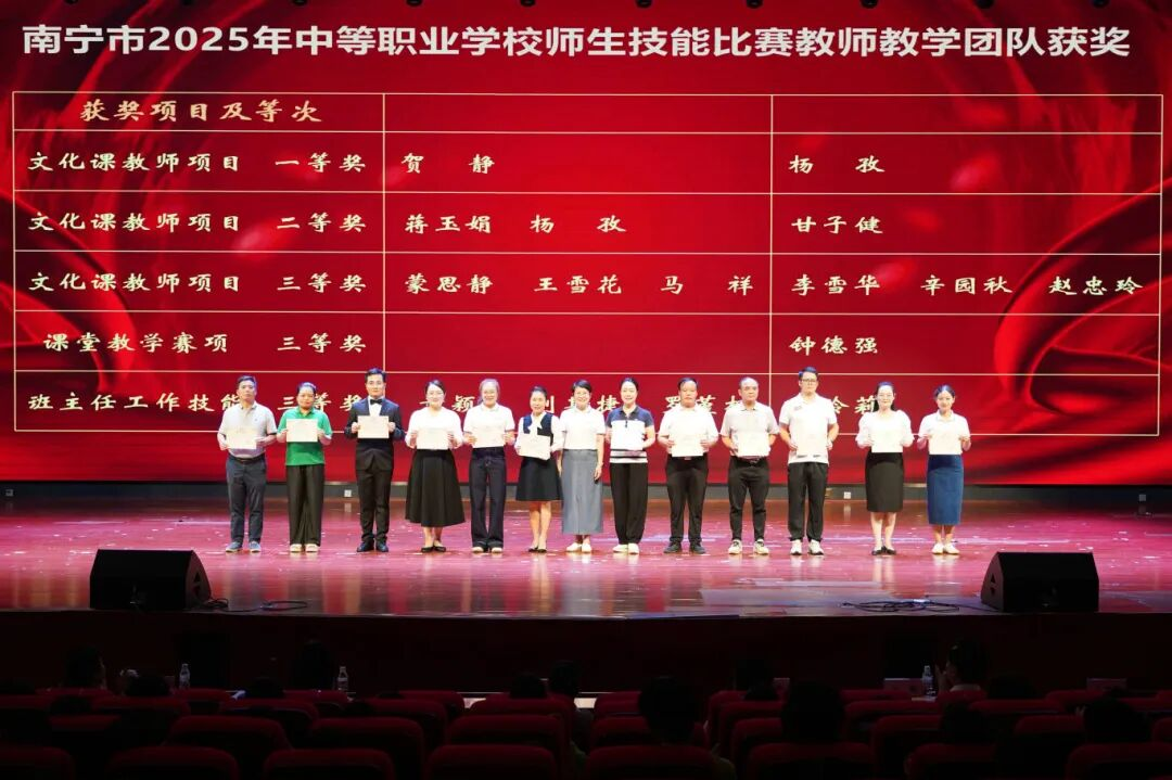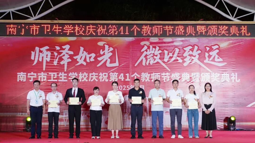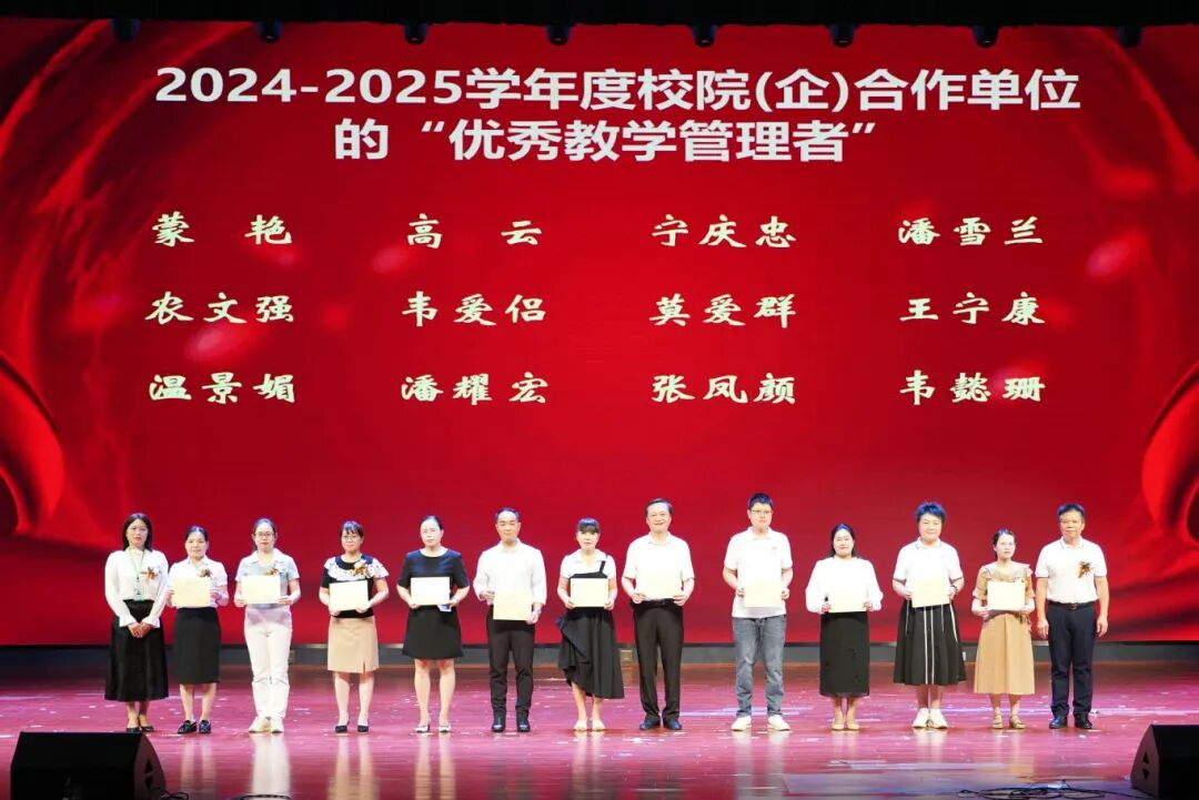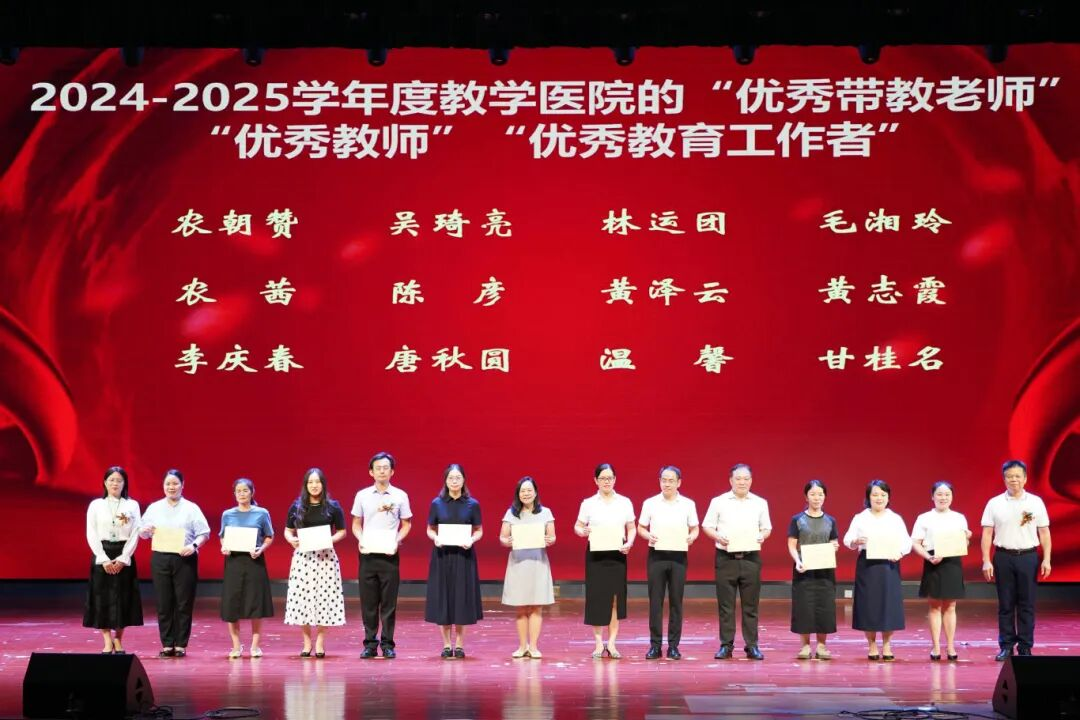 在“致敬楷模 薪火相传”篇章中,与会领导分别为2025年南宁市学科带头人、教学骨干,校级“三优”奖(优秀教师、优秀班主任、优秀教育工作者),教学医院及校企合作单位“三优”奖,课题结题奖、校外竞赛奖等获奖集体与个人颁奖。