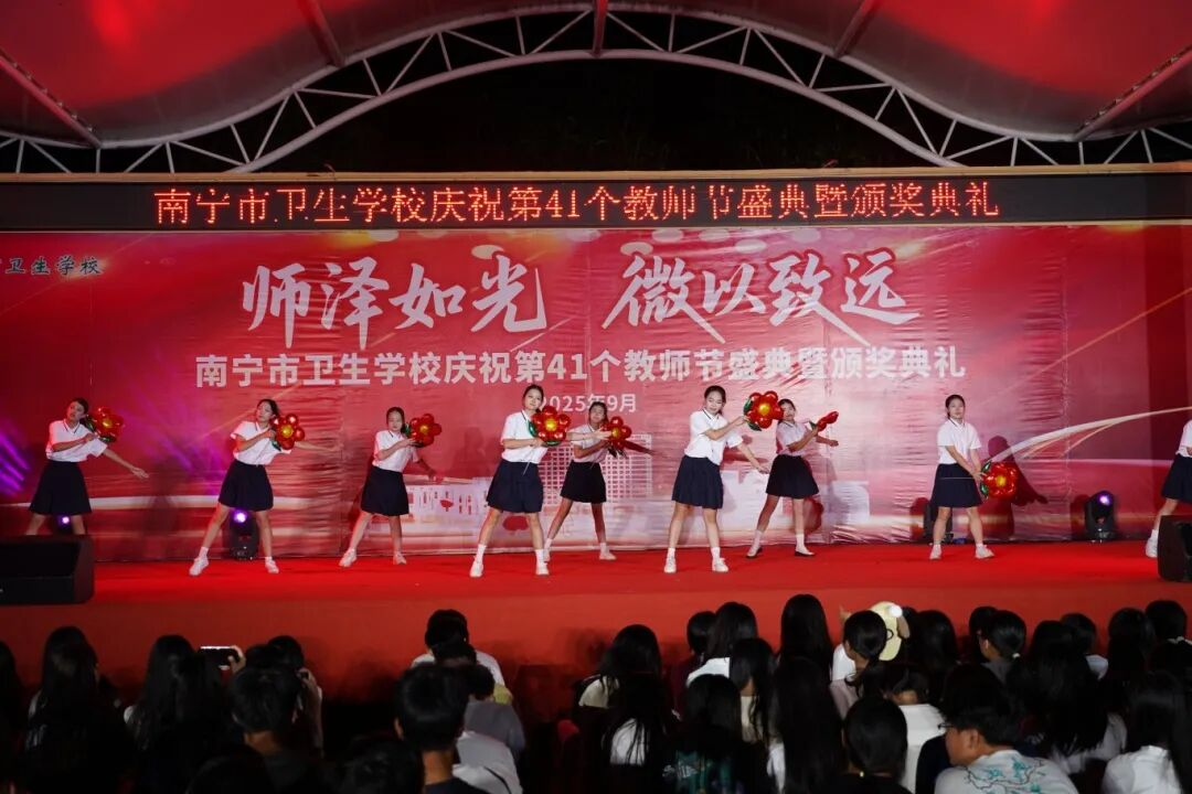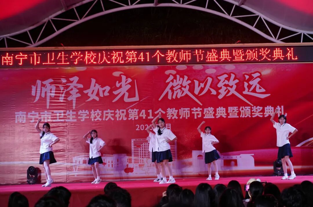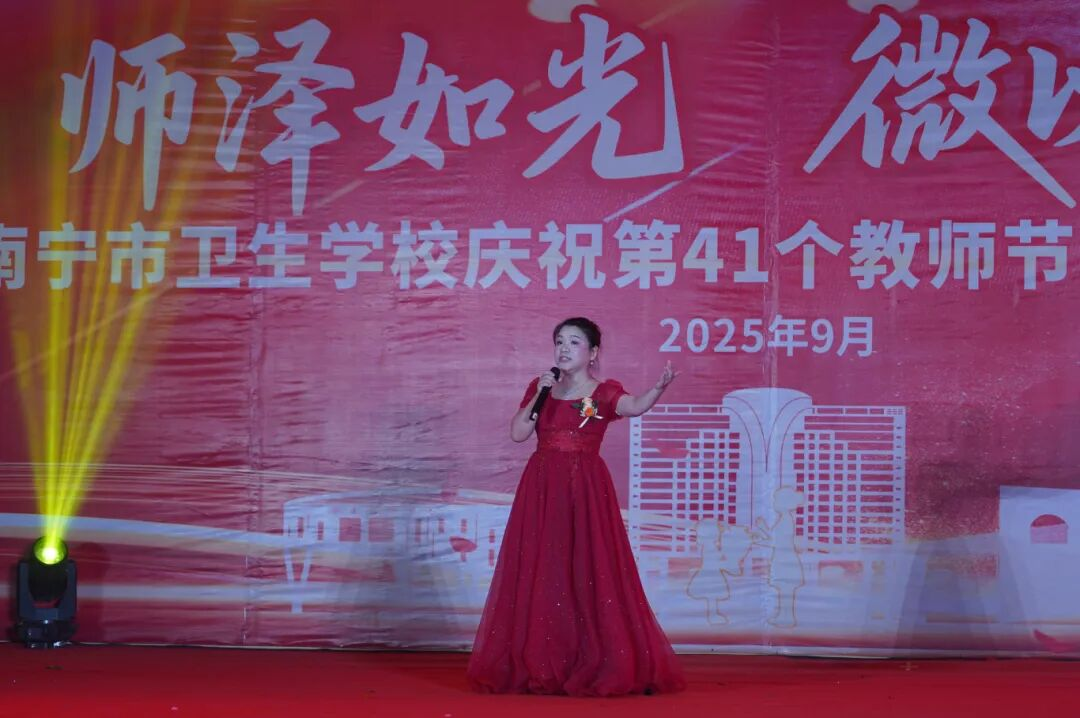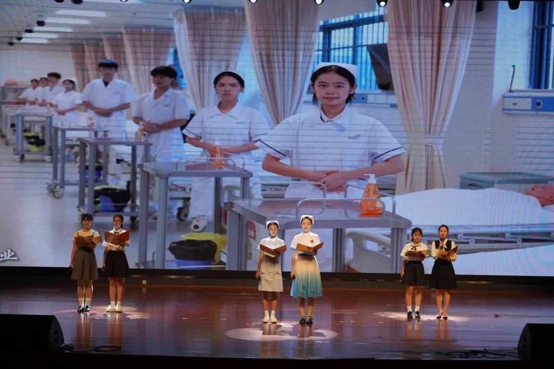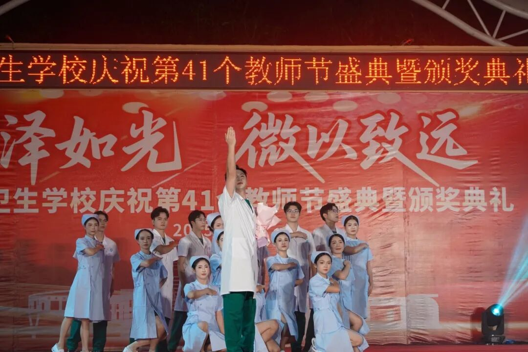 黎塘校区则通过师生舞蹈《教师之光》礼赞师者,歌曲《我家在中国》抒发家国情怀,舞蹈《与梦盛开》诠释逐梦力量,市第九人民医院参演的情景展示《医者仁心》以细腻表演深刻诠释医者使命,学生朗诵《白衣灯塔》更彰显卫校学子的责任担当。