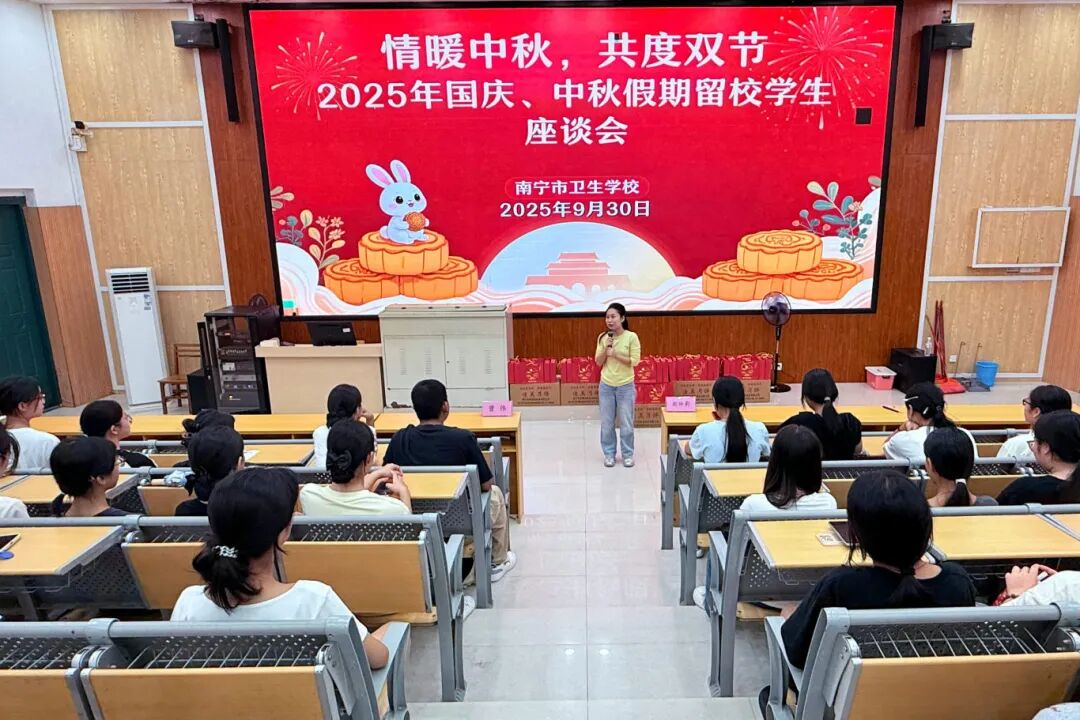 为进一步做好学生关爱服务工作,落实“一切以学生为中心”的服务理念,在国庆、中秋双节交汇的美好时刻,9月30日下午,南宁市卫生学校党委副书记、校长曾伟,副校长赵玲莉与留校学生齐聚一堂开展座谈活动,用暖心关怀传递校园温暖。