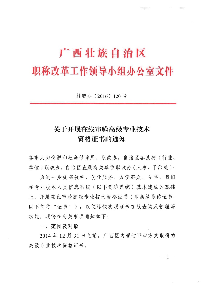 桂职办 2016 120号-关于开展在线审验高级专业技术资格证书的通知