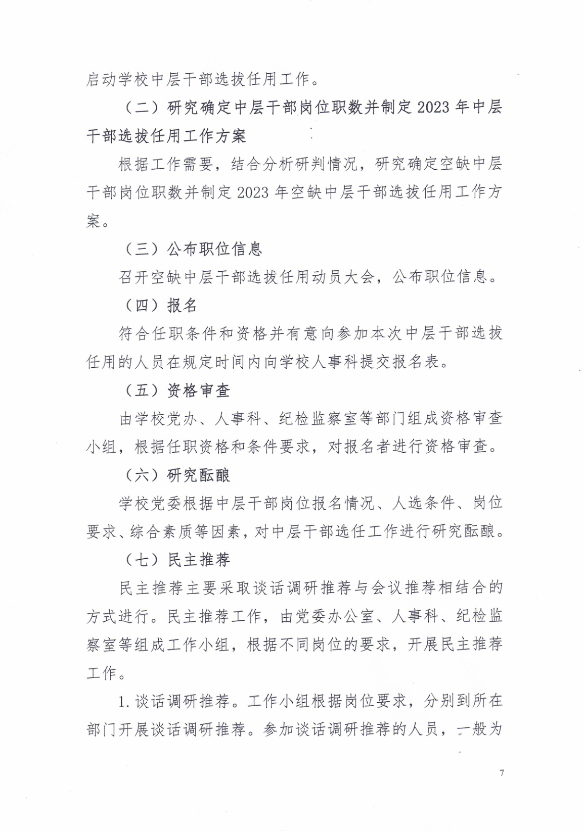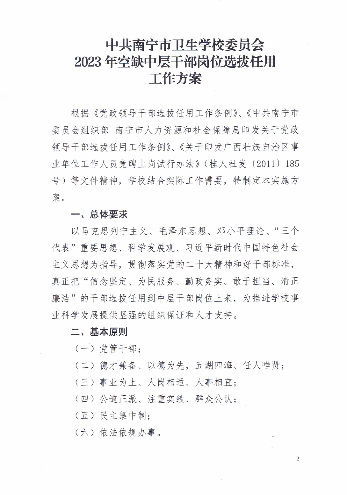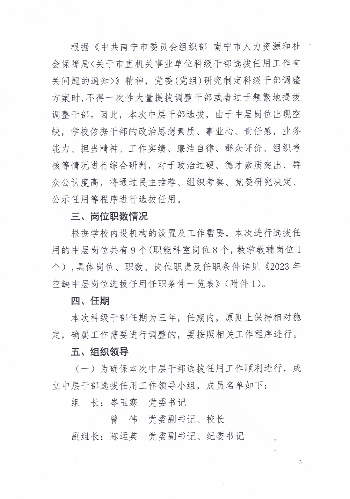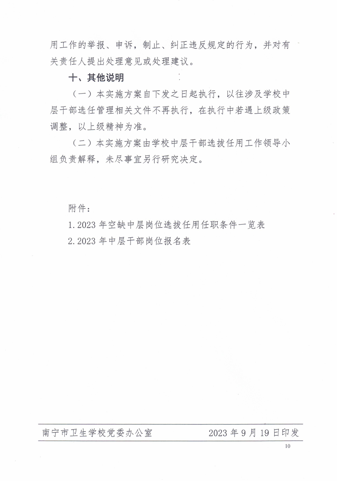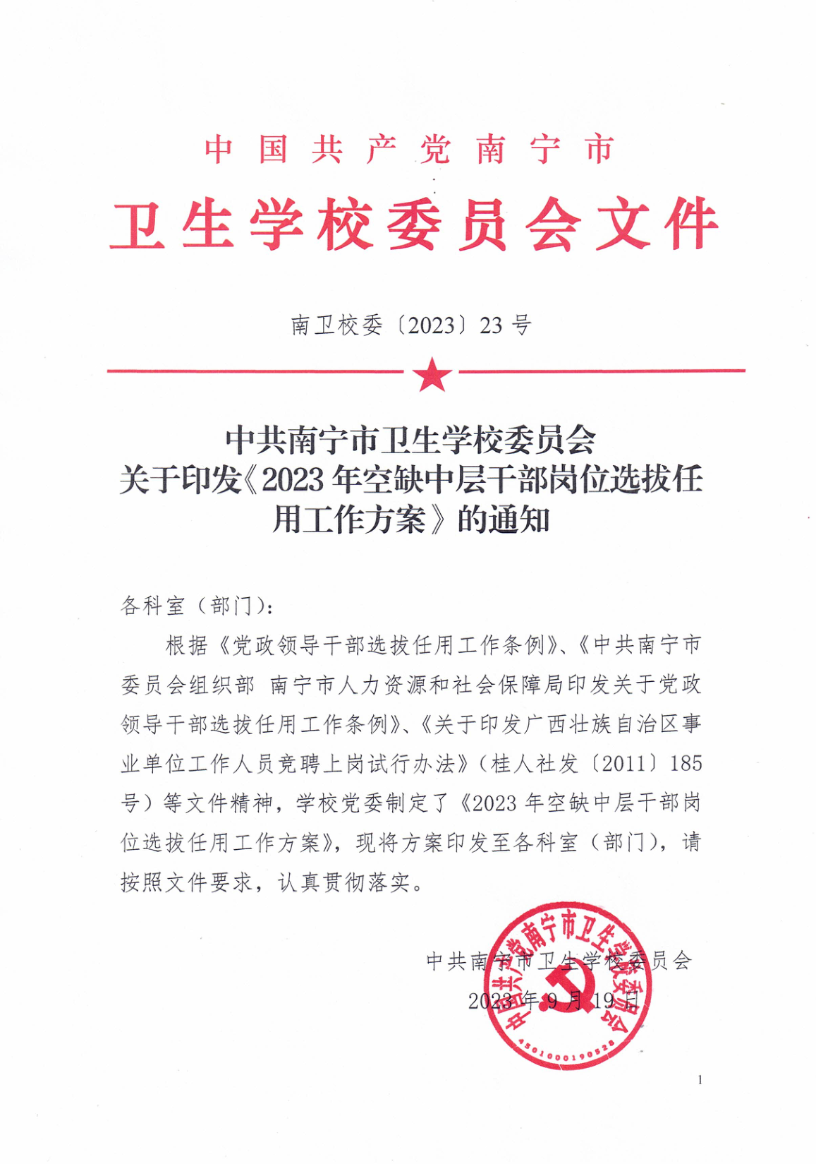 中共南宁市卫生学校委员会关于印发《2023年空缺中层干部岗位选拔任用工作方案》的通知